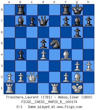 Last move : 0-1 2011 April 13 3:28:46 [Event "FICGS__CHESS__RAPID_B__000174"] [Site "FICGS"] [Date "2011.02.07"] [Round "1"] [White "Tronchere,Laurent"] [Black "Ambos,Ilmar"] [Result "0-1"] [WhiteElo "1781"] [BlackElo "1800"] 1.d4 Nf6 2.c4 g6 3.g3 Bg7 4.Bg2 O-O 5.Nc3 d6 6.Nf3 Nc6 7.O-O a6 8.h3 Rb8 9.e4 b5 10.cxb5 axb5 11.Re1 e6 12.Qc2 b4 13.Ne2 Bb7 14.Nf4 Qd7 15.e5 Nd5 16.Nxd5 exd5 17.Bf4 dxe5 18.Nxe5 Nxe5 0-1 This chess game has been lost on time (started : 2011.02.07 19:31:48) King's Indian : 3.g3 Kingside Castling by player Black (move 4) Kingside Castling by player White (move 7) Player Black won this chess game. Follow this game move after move (download)I guess a certain amount of temperament is expected of Chess geniuses. (Ron Gross) Im Reiche der Wirklichkeit ist man nie so glücklich wie im Reiche der Gedanken. (Arthur Schopenhauer) Todo lo que importa ante el tablero de Ajedrez son buenas jugadas. (Bobby Fischer) Je menace de comprendre la position. (Anonyme) Nothing is more important for teaching us to understand the concepts we have than constructing fictitious ones. (Ludwig Wittgenstein)