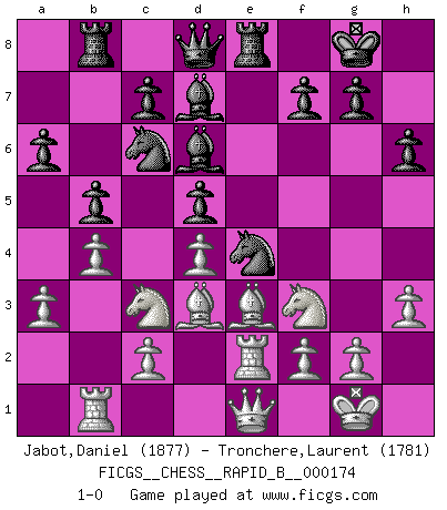 Last move : 1-0 2011 April 13 15:27:50 [Event "FICGS__CHESS__RAPID_B__000174"] [Site "FICGS"] [Date "2011.02.07"] [Round "1"] [White "Jabot,Daniel"] [Black "Tronchere,Laurent"] [Result "1-0"] [WhiteElo "1877"] [BlackElo "1781"] 1.e4 e6 2.d4 d5 3.Nc3 Nf6 4.exd5 exd5 5.Nf3 Bd6 6.Bd3 O-O 7.O-O h6 8.Be3 Re8 9.Ne2 Bg4 10.Nc3 Nc6 11.h3 Bc8 12.a3 a6 13.Re1 b5 14.Qc1 Rb8 15.b4 Bd7 16.Rb1 Ra8 17.Re2 Rb8 18.Qd2 Ne4 19.Qe1 1-0 This chess game has been lost on time (started : 2011.02.07 19:31:48) French defense Kingside Castling by player Black (move 6) Kingside Castling by player White (move 7) Player White won this chess game. Follow this game move after move (download)After black's reply to 1.e4 with 1..e5, leaves him always trying to get into the game. (Howard Staunton) Das typische an einem Großmeister ist, daß er eine gewonnene Position schnell und schmerzlos gewinnt. (Irving Chernev) Durante una competencia de Ajedrez, un Maestro de Ajedrez deberá ser una combinación de presa de caza y un Monge. (Alexander Alekhine) La menace est plus forte que l'exécution. (Aaron Nimzovitch) There are 10 types of people in this world: those who understand binary and those who don't. (Anonymous)