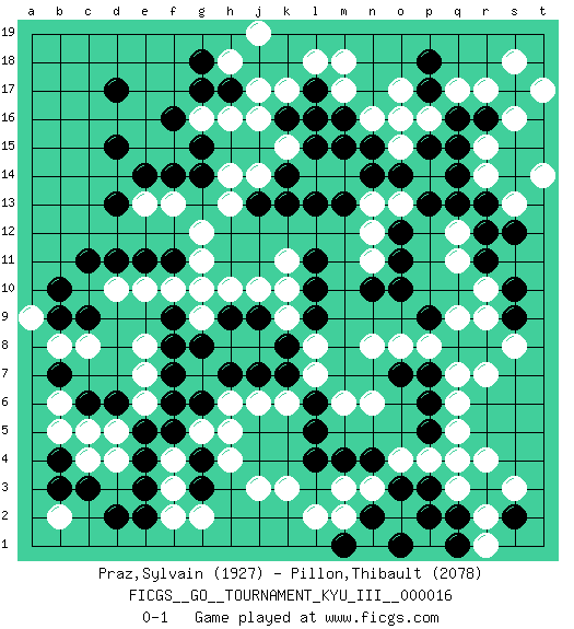 Last move : 0-1 2011 July 11 22:21:51 [Event "FICGS__GO__TOURNAMENT_KYU_III__000016"] [Site "FICGS"] [Date "2011.02.08"] [Round "1"] [Black "Praz,Sylvain"] [White "Pillon,Thibault"] [Result "0-1"] [Rating 1 "1927"] [Rating 2 "2078"] 1.r16 d4 2.d17 q4 3.c6 f4 4.c11 p16 5.q14 r17 6.s17 q17 7.m16 r15 8.q15 s16 9.q16 s18 10.p17 r10 11.p18 t17 12.d15 c8 13.o3 q6 14.q2 n3 15.n4 m3 16.m4 o2 17.p3 k3 18.l4 j3 19.r3 r4 20.p5 q3 21.p2 r2 22.n2 m2 23.o1 k17 24.h17 k15 25.k13 h16 26.g17 l14 27.l13 m14 28.n15 n13 29.o12 g16 30.f16 o13 31.p13 n12 32.o11 n11 33.o10 c5 34.d6 e8 35.f6 j6 36.g8 d10 37.d11 f10 38.e11 g9 39.h7 g12 40.h9 h10 41.j9 k11 42.r8 l7 43.l9 q9 44.q8 p8 45.p7 q7 46.p9 o8 47.s10 r9 48.p6 q5 49.r11 s8 50.l11 k10 51.l10 k9 52.k8 j10 53.j7 l8 54.f9 e10 55.g10 g11 56.f11 g9 57.n10 g10 58.g14 j14 59.j13 h13 60.m13 h14 61.n14 n6 62.l6 k6 63.k7 m6 64.l5 h6 65.g6 h4 66.f8 p4 67.o7 n8 68.g15 e7 69.f7 e6 70.c3 c4 71.b4 b5 72.d2 b2 73.g3 f2 74.g4 g5 75.f5 h5 76.e4 f3 77.e5 d5 78.e3 g2 79.b3 b6 80.q1 o4 81.s2 s3 82.e2 r14 83.r13 q11 84.r12 q12 85.q13 f13 86.e14 e13 87.d13 m18 88.l17 l18 89.l15 m17 90.k16 j16 91.l16 n16 92.m15 o15 93.k14 o17 94.o14 j17 95.b9 r1 96.p15 o16 97.s9 r7 98.b7 b8 99.c9 a9 100.b10 h18 101.g18 j19 102.f14 s13 103.s12 t14 104.m1 l2 0-1 Here are the names of the openings (joseki) played in the four corners : Corner d4 : d4 c6 Hoshi (Hwajeom, Seongjeom, Xingwei`) 4-4 Point. The star or hoshi (4-4) point, emphasizing influence at the potential expense of territory. Ikken Kakari (Hankan Keolch'im, Yi Gua`jiao~, 1-Space Low Approach). Black 2 is the standard approach move to the 4-4. Corner q16 : r16 p16 Komoku (Somok, Xiao~mu`) 3-4 Point. The komoku (3-4) point is the traditional corner enclosure move.. Ikken Takagakari (Hankan Nop'dakeolch'im, Yi Gaogua`jiao~, 1-Space High Approach). The 5-4 approach move has become more popular in modern times, as modern Go emphasizes speed and influence. Corner q4 : q4 o3 Hoshi (Hwajeom, Seongjeom, Xingwei`) 4-4 Point. The star or hoshi (4-4) point, emphasizing influence at the potential expense of territory. Ikken Kakari (Hankan Keolch'im, Yi Gua`jiao~, 1-Space Low Approach). Black 2 is the standard approach move to the 4-4. Player White won this Go (weiqi, baduk) game. Follow this game move after move (download)Don't get surrounded ! Ever ! (Anonymous) The existence of forgetting has never been proved: We only know that some things don't come to mind when we want them. (Friedrich Nietzsche)