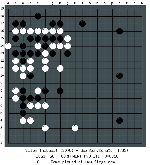 Last move : 0-1 2011 April 29 3:9:1 [Event "FICGS__GO__TOURNAMENT_KYU_III__000016"] [Site "FICGS"] [Date "2011.02.08"] [Round "1"] [Black "Pillon,Thibault"] [White "Guanter,Renato"] [Result "0-1"] [Rating 1 "2078"] [Rating 2 "1785"] 1.q16 d4 2.q4 d16 3.q10 k3 4.c14 f16 5.c6 d6 6.d7 e6 7.c5 c4 8.d10 f3 9.h17 e14 10.l17 d12 11.c12 c11 12.d13 b12 13.c13 d11 14.e13 b8 15.c8 b7 16.c7 c10 17.f8 f11 18.h8 e8 19.e7 f6 20.g13 h11 21.c17 c16 22.b17 b16 23.e18 h16 24.g17 g16 25.j13 f13 26.f14 f12 27.e15 g14 28.f15 e16 29.g15 h14 30.h15 j15 31.d15 j14 32.b13 b11 33.b15 a14 0-1 Here are the names of the openings (joseki) played in the four corners : Corner d16 : d16 c14 Hoshi (Hwajeom, Seongjeom, Xingwei`) 4-4 Point. The star or hoshi (4-4) point, emphasizing influence at the potential expense of territory. Ikken Kakari (Hankan Keolch'im, Yi Gua`jiao~, 1-Space Low Approach). Black 2 is the standard approach move to the 4-4. Corner d4 : d4 c6 Hoshi (Hwajeom, Seongjeom, Xingwei`) 4-4 Point. The star or hoshi (4-4) point, emphasizing influence at the potential expense of territory. Ikken Kakari (Hankan Keolch'im, Yi Gua`jiao~, 1-Space Low Approach). Black 2 is the standard approach move to the 4-4. Player White won this Go (weiqi, baduk) game. Follow this game move after move (download)While the Baroque rules of chess could only have been created by humans, the rules of go are so elegant, organic, and rigorously logical that if intelligent life forms exist elsewhere in the universe, they almost certainly play go. (Edward Lasker, international chess master) Creativity is allowing yourself to make mistakes. Art is knowing which ones to keep. (Scott Adams)