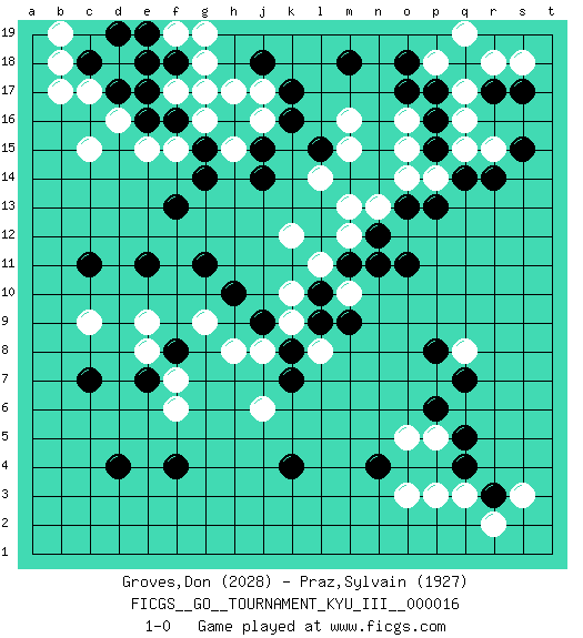 Last move : 1-0 2011 February 28 1:14:25 [Event "FICGS__GO__TOURNAMENT_KYU_III__000016"] [Site "FICGS"] [Date "2011.02.08"] [Round "1"] [Black "Groves,Don"] [White "Praz,Sylvain"] [Result "1-0"] [Rating 1 "2028"] [Rating 2 "1927"] 1.d4 q16 2.d17 q3 3.q5 q8 4.n4 p5 5.p6 o5 6.q4 o3 7.r3 p3 8.p8 r2 9.q7 s3 10.c11 g17 11.k16 d16 12.o17 c17 13.e17 c15 14.c18 b17 15.f16 g16 16.g15 j16 17.j15 f15 18.h16 j17 19.k17 h17 20.g14 f17 21.e16 e15 22.f18 g18 23.e18 b18 24.d19 f19 25.e19 g19 26.r14 h15 27.j14 o16 28.p17 q17 29.p16 r15 30.q14 q15 31.p15 p14 32.p13 o14 33.o13 o15 34.q18 r18 35.s15 p18 36.o18 q19 37.k4 c9 38.c7 e9 39.e11 g9 40.g11 m16 41.m18 n13 42.n12 m13 43.o11 m12 44.m11 k12 45.h10 l11 46.j9 f6 47.l15 m15 48.e7 f7 49.f8 e8 50.l10 m10 51.n11 k10 52.l9 k9 53.k8 l8 54.m9 j8 55.k7 h8 56.f13 l14 57.f4 j6 58.j18 b19 59.s17 s18 60.r17 1-0 Here are the names of the openings (joseki) played in the four corners : Corner q4 : q3 q5 Komoku (Somok, Xiao~mu`) 3-4 Point. The komoku (3-4) point is the traditional corner enclosure move.. Ikken Takagakari (Hankan Nop'dakeolch'im, Yi Gaogua`jiao~, 1-Space High Approach). The 5-4 approach move has become more popular in modern times, as modern Go emphasizes speed and influence. Corner q16 : q16 o17 Hoshi (Hwajeom, Seongjeom, Xingwei`) 4-4 Point. The star or hoshi (4-4) point, emphasizing influence at the potential expense of territory. Ikken Kakari (Hankan Keolch'im, Yi Gua`jiao~, 1-Space Low Approach). Black 2 is the standard approach move to the 4-4. Corner d4 : d4 c9 Hoshi (Hwajeom, Seongjeom, Xingwei`) 4-4 Point. The star or hoshi (4-4) point, emphasizing influence at the potential expense of territory. Player Black won this Go (weiqi, baduk) game. Follow this game move after move (download)When your opponent is thick, you must also become thick. (Otake Hideo, 9p) Man with more than one clock never knows what time it is. (Chinese thought)