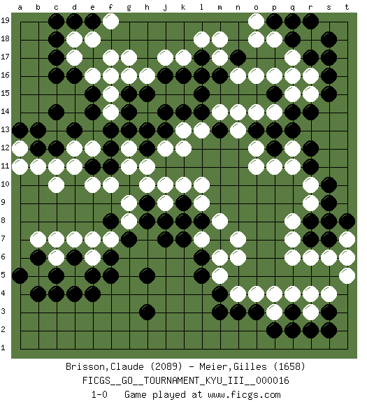 Last move : 1-0 2011 February 24 20:34:36 [Event "FICGS__GO__TOURNAMENT_KYU_III__000016"] [Site "FICGS"] [Date "2011.02.08"] [Round "1"] [Black "Brisson,Claude"] [White "Meier,Gilles"] [Result "1-0"] [Rating 1 "2089"] [Rating 2 "1658"] 1.d16 q4 2.o3 q6 3.c4 q16 4.h3 f17 5.c14 j17 6.r14 o16 7.s16 r9 8.r17 q17 9.r11 c10 10.c12 c7 11.e4 d18 12.c17 e10 13.q2 r3 14.r2 r18 15.s18 e6 16.r7 q7 17.r8 q8 18.s9 r10 19.s10 q11 20.r12 q12 21.q13 o12 22.m16 m17 23.n17 n16 24.l17 m18 25.l16 l18 26.j16 k17 27.k16 h16 28.h15 g16 29.g15 j15 30.j14 k15 31.l14 m14 32.l15 g11 33.f12 g12 34.g13 j12 35.h5 n6 36.m4 l13 37.m13 k13 38.k14 n14 39.o13 n13 40.l6 m8 41.p12 p11 42.p13 o11 43.j7 k8 44.j8 j9 45.h9 h10 46.k9 j10 47.l8 l9 48.k7 l10 49.m7 n7 50.f8 g9 51.h8 g8 52.g7 f7 53.f6 e7 54.f5 d5 55.d4 m5 56.l5 n4 57.n3 o4 58.s3 s4 59.q3 r4 60.s2 f15 61.e17 e18 62.e15 f14 63.f16 g17 64.f13 e16 65.e14 d17 66.c16 t7 67.t6 s6 68.s7 t5 69.t8 t6 70.c18 r16 71.s17 r15 72.s15 b11 73.b12 b5 74.b4 r6 75.s8 f16 76.g14 m6 77.f11 f10 78.c5 c6 79.b6 b7 80.a5 l7 81.k8 k10 82.m3 d12 83.d13 e12 84.h13 c11 85.h12 a12 86.a13 a11 87.b13 h11 88.e5 p3 89.p2 p4 90.d6 d7 91.p15 q15 92.q14 p16 93.q18 p18 94.r19 o14 95.p19 o19 96.q19 o18 97.e11 d11 98.j13 k12 99.d19 p14 100.e19 f19 101.c19 1-0 Here are the names of the openings (joseki) played in the four corners : Corner q4 : q4 o3 Hoshi (Hwajeom, Seongjeom, Xingwei`) 4-4 Point. The star or hoshi (4-4) point, emphasizing influence at the potential expense of territory. Ikken Kakari (Hankan Keolch'im, Yi Gua`jiao~, 1-Space Low Approach). Black 2 is the standard approach move to the 4-4. Corner d16 : d16 f17 Hoshi (Hwajeom, Seongjeom, Xingwei`) 4-4 Point. The star or hoshi (4-4) point, emphasizing influence at the potential expense of territory. Ikken Kakari (Hankan Keolch'im, Yi Gua`jiao~, 1-Space Low Approach). White 2 is the standard approach move to the 4-4. Corner q16 : q16 r14 Hoshi (Hwajeom, Seongjeom, Xingwei`) 4-4 Point. The star or hoshi (4-4) point, emphasizing influence at the potential expense of territory. Ikken Kakari (Hankan Keolch'im, Yi Gua`jiao~, 1-Space Low Approach). Black 2 is the standard approach move to the 4-4. Player Black won this Go (weiqi, baduk) game. Follow this game move after move (download)With only one group, you will win. (Anonymous) Good luck. You're gonna need it. (Han Solo in Star Wars ep.6)