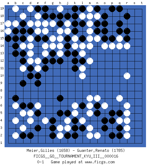 Last move : 0-1 2011 March 3 22:19:52 [Event "FICGS__GO__TOURNAMENT_KYU_III__000016"] [Site "FICGS"] [Date "2011.02.08"] [Round "1"] [Black "Meier,Gilles"] [White "Guanter,Renato"] [Result "0-1"] [Rating 1 "1658"] [Rating 2 "1785"] 1.q16 d4 2.d16 q4 3.c6 f4 4.c9 r10 5.k16 r14 6.r15 q14 7.o15 m17 8.l17 p17 9.q17 q18 10.r18 p16 11.p15 m15 12.n16 m16 13.n17 n18 14.o18 q15 15.r16 l18 16.k18 p18 17.n19 m18 18.o17 n15 19.o16 o14 20.q19 e6 21.o3 r6 22.l3 p3 23.o4 j3 24.k4 j4 25.j5 k5 26.h5 k6 27.h7 m5 28.g4 l4 29.k3 m3 30.j2 h3 31.g3 h2 32.k2 m2 33.g2 o6 34.e9 b4 35.d2 c3 36.c2 b2 37.e3 c5 38.d6 b6 39.b7 d5 40.e5 c14 41.c15 d14 42.c12 k14 43.f15 j17 44.k17 j16 45.j15 k15 46.j18 g17 47.g18 f17 48.f18 e17 49.d18 d17 50.c17 e18 51.e19 c18 52.h17 h16 53.g16 h15 54.h18 b17 55.c16 d19 56.f19 b19 57.k19 h19 58.j14 h14 59.j13 h13 60.l19 m19 61.l15 p14 62.p19 l14 63.h12 f13 64.g13 g14 65.g12 f14 66.b16 a17 67.b14 d12 68.d11 e12 69.k13 l13 70.l12 m14 71.c13 e11 72.e10 a16 73.a15 e16 74.b13 c11 75.d10 m12 76.k11 l11 77.k12 l10 78.e15 d15 79.b15 d13 80.f11 g15 81.f12 f16 82.p5 q7 83.q5 r5 84.n5 m7 85.n6 n7 86.q3 r3 87.q2 r2 88.p2 n2 89.p4 r4 90.l6 m6 0-1 Here are the names of the openings (joseki) played in the four corners : Corner d4 : d4 c6 Hoshi (Hwajeom, Seongjeom, Xingwei`) 4-4 Point. The star or hoshi (4-4) point, emphasizing influence at the potential expense of territory. Ikken Kakari (Hankan Keolch'im, Yi Gua`jiao~, 1-Space Low Approach). Black 2 is the standard approach move to the 4-4. Corner q16 : q16 r14 Hoshi (Hwajeom, Seongjeom, Xingwei`) 4-4 Point. The star or hoshi (4-4) point, emphasizing influence at the potential expense of territory. Ikken Kakari (Hankan Keolch'im, Yi Gua`jiao~, 1-Space Low Approach). White 2 is the standard approach move to the 4-4. Corner q4 : q4 o3 Hoshi (Hwajeom, Seongjeom, Xingwei`) 4-4 Point. The star or hoshi (4-4) point, emphasizing influence at the potential expense of territory. Ikken Kakari (Hankan Keolch'im, Yi Gua`jiao~, 1-Space Low Approach). Black 2 is the standard approach move to the 4-4. Corner d16 : d16 c14 Hoshi (Hwajeom, Seongjeom, Xingwei`) 4-4 Point. The star or hoshi (4-4) point, emphasizing influence at the potential expense of territory. Ikken Kakari (Hankan Keolch'im, Yi Gua`jiao~, 1-Space Low Approach). White 2 is the standard approach move to the 4-4. Player White won this Go (weiqi, baduk) game. Follow this game move after move (download)You don't have to be really good anymore to get good results. What's happening with chess is that it's gradually losing its place as the par excellence of intellectual activity. Smart people in search of a challenging board game might try a game called Go. (Hans Berliner, The New York Times, 2003) The quality of decision is like the well-timed swoop of a falcon which enables it to strike and destroy its victim. (Sun Tzu)