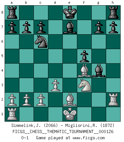 Last move : 0-1 2011 February 27 15:8:29 [Event "FICGS__CHESS__THEMATIC_TOURNAMENT__000126"] [Site "FICGS"] [Date "2011.02.08"] [Round "1"] [White "Simmelink,Joop"] [Black "Migliorini,Roberto"] [Result "0-1"] [WhiteElo "2066"] [BlackElo "1872"] 1.e4 e5 2.f4 exf4 3.g3 fxg3 4.Nf3 d5 5.Qe2 dxe4 6.Nc3 gxh2 7.Rxh2 Nf6 8.d3 Nc6 9.Nxe4 Nxe4 10.Qxe4+ Qe7 11.Bf4 Bg4 12.Be2 f5 13.Qxe7+ Bxe7 0-1 King's gambit accepted Player Black won this chess game. Follow this game move after move (download)White lost because he failed to remember the right continuation and had to think up the moves himself. (Siegbert Tarrasch) Nicht daß Diemer aus Opportunismus Mitglied der NSDAP geworden wäre. Er war ein Fanatiker, in allem, was er tat. (Hans Ree) El Ajedrez es parte de una cultura y si una cultura esta en decadencia, entonces también el Ajedrez declinará. (Mikhail Botvinnik) Même si vous avez un bon coup à faire, regardez toujours s'il n'y en a pas un qui lui soit préférable. (Pedro Damiano) Somehow our devils are never quite what we expect when we meet them face to face. (Nelson DeMille)