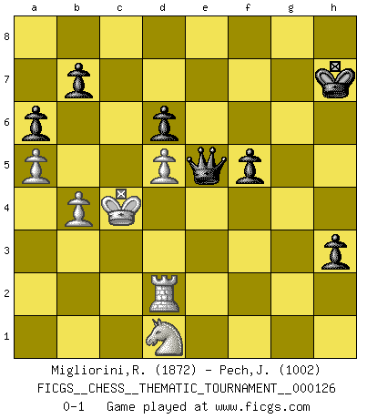 Last move : 0-1 2011 October 27 8:13:45 [Event "FICGS__CHESS__THEMATIC_TOURNAMENT__000126"] [Site "FICGS"] [Date "2011.02.08"] [Round "1"] [White "Migliorini,Roberto"] [Black "Pech,Jaroslav"] [Result "0-1"] [WhiteElo "1872"] [BlackElo "1002"] 1.e4 e5 2.f4 exf4 3.g3 Nc6 4.d4 fxg3 5.hxg3 Nf6 6.Nc3 Bb4 7.Bg5 d6 8.Qd3 h6 9.d5 Bxc3+ 10.Qxc3 Ne5 11.Bxf6 Qxf6 12.Qxc7 O-O 13.Qc3 Bg4 14.Qb3 Rac8 15.Rh2 Qg6 16.Be2 Qxe4 17.O-O-O Rxc2+ 18.Qxc2 Rc8 19.Bxg4 Rxc2+ 20.Rxc2 Nxg4 21.Re2 Qf5 22.Re8+ Kh7 23.Ne2 Ne5 24.Rd2 Qe4 25.Nc3 Nd3+ 26.Kb1 Qxe8 27.Rxd3 Qe1+ 28.Kc2 Qf2+ 29.Kb3 f5 30.a4 a6 31.Nd1 Qe2 32.Kc3 g5 33.b4 h5 34.a5 h4 35.gxh4 gxh4 36.Rd2 Qe5+ 37.Kc4 h3 0-1 King's gambit accepted Kingside Castling by player Black (move 12) Queenside Castling by player White (move 17) Player Black won this chess game. Follow this game move after move (download)War is the child of passion, passion is the child of narcissism and narcissism is the child. (...) Another game ? (Thibault de Vassal) Ich habe die besten Aussichten, den ersten Preis zu gewinnen - denn jeder muss gegen Steinitz spielen, nur ich nicht! (Wilhelm Steinitz) Debemos de asegurarnos de que el Ajedrez no se convierta en un lenguaje muerto, muy interesante, pero solo para un grupo muy pequeño. (Sytze Faber) Pour se monter efficace, un Cavalier a besoin d'avant-postes ! Les Cavaliers font les meilleurs bloqueurs de pions passés. Lottery : A tax on people who are bad at math. (Author unknown)