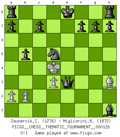 Last move : 0-1 2011 April 4 21:10:20 [Event "FICGS__CHESS__THEMATIC_TOURNAMENT__000126"] [Site "FICGS"] [Date "2011.02.08"] [Round "1"] [White "Zaunercik,Ilmar"] [Black "Migliorini,Roberto"] [Result "0-1"] [WhiteElo "1276"] [BlackElo "1872"] 1.e4 e5 2.f4 exf4 3.g3 fxg3 4.hxg3 d5 5.Qf3 Qe7 6.Nc3 Nf6 7.e5 Qxe5+ 8.Nge2 d4 9.Nd1 Nc6 10.Nf2 Be6 11.Bh3 Bd5 12.Nd3 Bxf3 13.Ndf4 Bxh1 14.Nd3 Qh5 15.Ndf4 Qf3 16.d3 Nb4 17.Nxd4 Qxg3+ 18.Ke2 Bc5 19.Be3 Bxd4 20.Bxd4 Nxc2 21.Rc1 Nxd4+ 22.Kd2 Qxf4+ 23.Kc3 Nd5+ 24.Kc4 b5+ 25.Kc5 Qxc1+ 26.Kxd4 Qe3+ 0-1 Comment by player 2 : Roberto Migliorini : But this is a chess mate! King's gambit accepted Player Black won this chess game. Follow this game move after move (download)Fischer prefers to enter Chess history alone. (Miguel Najdorf) Am wohlsten fühle ich mich, wenn ich sehe, wie sich mein Gegner im Todeskampf windet. (Robert James Fischer) Uno por uno, yo los acribillé, mi superioridad muy pronto se volvio aparente. (Jose Capablanca) Avant la finale, les dieux ont créé le milieu de partie. (Tarrasch) Are you threatening me, Master Jedi ? (Chancellor Palpatine in Star Wars ep.3)