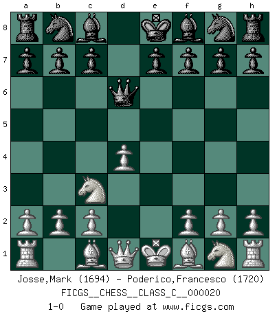 Last move : 1-0 2007 February 10 15:40:33 [Event "FICGS__CHESS__CLASS_C__000020"] [Site "FICGS"] [Date "2006.12.06"] [Round "1"] [White "Josse,Mark"] [Black "Poderico,Francesco"] [Result "1-0"] [WhiteElo "1694"] [BlackElo "1720"] 1.e4 d5 2.exd5 Qxd5 3.Nc3 Qd6 4.d4 1-0 This chess game has been lost on time (started : 2006.12.06 16:13:10) Scandinavian : Pytel-Wade variation Player White won this chess game. Follow this game move after move (download)Play the opening like a book, the middle game like a magician, and the endgame like a machine. (Spielmann) Ich hatte Zahnschmerzen im ersten Spiel. In der zweiten Partie tat mir der Kopf weh. In der dritten war es eine Rheuma-Attacke und während der vierten fühlte ich mich nicht gut. Und in der fünften? Nun, man muss doch nicht jedes Spiel gewinnen, oder? (Savielly Grigorievitsch Tartakower) Me siento como si fuera una pieza en una partida de Ajedrez, cuando mi oponente me indica: esa pieza no puede ser movida. (Soren Kierkegaard) Mon pion favori sur ma case favorite ! Bronstein en parlant d'un coup de pion en h5 quand il avait les Noirs. The Internet is the first thing that humanity has build that humanity doesn't understand, the largest experiment in anarchy that we have ever had. (Eric Schmidt)