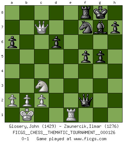 Last move : 0-1 2011 May 18 6:46:50 [Event "FICGS__CHESS__THEMATIC_TOURNAMENT__000126"] [Site "FICGS"] [Date "2011.02.08"] [Round "1"] [White "Glosery,John"] [Black "Zaunercik,Ilmar"] [Result "0-1"] [WhiteElo "1429"] [BlackElo "1276"] 1.e4 e5 2.f4 exf4 3.g3 fxg3 4.Nf3 gxh2 5.Rxh2 Nc6 6.Nc3 d6 7.d4 Bg4 8.Bg5 Bxf3 9.Qxf3 f6 10.Bh4 Nxd4 11.Qh5+ g6 12.Qg4 Nh6 13.Qg2 Qe7 14.O-O-O Nc6 15.Bb5 a6 16.Bxc6+ bxc6 17.Qf3 g5 18.Bf2 Bg7 19.e5 O-O 20.Qxc6 Qxe5 21.R2h1 Qf4+ 22.Kb1 Qxf2 23.Qxc7 Nf7 24.Ne4 Qf3 25.Rde1 Rae8 26.Nc3 f5 27.Rhf1 Rxe1+ 28.Rxe1 Qf2 0-1 King's gambit accepted Queenside Castling by player White (move 14) Kingside Castling by player Black (move 19) Player Black won this chess game. Follow this game move after move (download)Methodical thinking is of more use in Chess than inspiration. (C. J. S. Purdy) Schach ist Kampf, hauptsächlich jedoch gegen die eigenen Fehler. (Savielly Grigorievitsch Tartakower) Con el fin de mejorar tu juego, debes de estudiar los finales antes que todo, ya que mientras que los finales pueden ser estudiados y dominados por sí mismos, el juegomedio y la apertura deben de ser estudiados en relación con los finales. (José Raúl Capablanca) Les Echecs sont et restent toujours un combat, un combat intégral comme la boxe, la lutte ou un autre sport, et où il doit y avoir un vainqueur et un vaincu. (Joseph Emil Diemer) Think like a man of action, act like a man of thought. (Henri Louis Bergson)