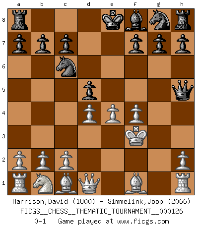 Last move : 0-1 2011 February 26 20:58:43 [Event "FICGS__CHESS__THEMATIC_TOURNAMENT__000126"] [Site "FICGS"] [Date "2011.02.08"] [Round "1"] [White "Harrison,David"] [Black "Simmelink,Joop"] [Result "0-1"] [WhiteElo "1800"] [BlackElo "2066"] 1.e4 e5 2.f4 exf4 3.g3 d5 4.gxf4 Qh4+ 5.Ke2 Bg4+ 6.Nf3 Nc6 7.d4 Bxf3+ 8.Kxf3 Qh5+ 0-1 King's gambit accepted Player Black won this chess game. Follow this game move after move (download)Chess is thirty to forty percent psychology. You don't have this when you play a computer. I can't confuse it. (Judith Polgar) Das Schachspiel ist ein See, in welchem eine Mücke baden und ein Elefant ertrinken kann. (Emanuel Lasker) Observen a Garry Kasparov. Después de una derrota, invariablemente el gana la próxima partida. Prácticamente hace pedazos a su siguiente oponente. Eso es algo que tenemos que aprender a lograr. (Maurice Ashley) Les échecs sont un jeu par leur forme, un art par leur essence et une science par sa difficulté d'acquisition. Ils peuvent vous procurer autant de plaisir qu'un bon livre ou une belle musique, mais vous n'aurez une réelle joie que si vous arrivez à bien jouer. (Tigran Petrosian) He who fights with monsters should be careful lest he thereby become a monster. (Friedrich Nietzsche, Beyond Good and Evil)