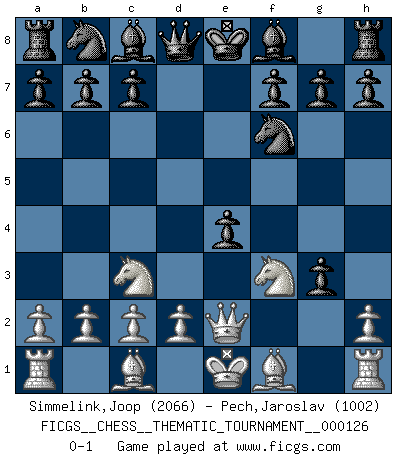 Last move : 0-1 2011 April 4 19:12:3 [Event "FICGS__CHESS__THEMATIC_TOURNAMENT__000126"] [Site "FICGS"] [Date "2011.02.08"] [Round "1"] [White "Simmelink,Joop"] [Black "Pech,Jaroslav"] [Result "0-1"] [WhiteElo "2066"] [BlackElo "1002"] 1.e4 e5 2.f4 exf4 3.g3 fxg3 4.Nf3 d5 5.Nc3 dxe4 6.Qe2 Nf6 0-1 King's gambit accepted Player Black won this chess game. Follow this game move after move (download)It is difficult to play against Einstein's theory --on his first loss to Fischer. (Mikhail Tal) Die FIDE ist dabei in die Hände der russischen Mafia zu fallen. (Larry Evans) A través de las casillas del tablero, los Indios explican el movimiento del tiempo y la edad, las influencias mas altas que controlan el mundo y los lazos que vinculan al Ajedrez con el alma humana. (Al-Masudi) Les sacrifices démontrent seulement que quelqu'un a gaffé. (Savielly Tartacover) Life is pleasant. Death is peaceful. It's the transition that's troublesome. (Isaac Asimov)