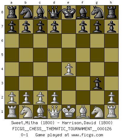 Last move : 0-1 2011 March 23 0:35:0 [Event "FICGS__CHESS__THEMATIC_TOURNAMENT__000126"] [Site "FICGS"] [Date "2011.02.08"] [Round "1"] [White "Sweet,Mitha"] [Black "Harrison,David"] [Result "0-1"] [WhiteElo "1800"] [BlackElo "1800"] 1.e4 e5 2.f4 exf4 3.g3 fxg3 0-1 This chess game has been lost on time (started : 2011.02.08 13:45:6) King's gambit accepted Player Black won this chess game. Follow this game move after move (download)There's never before been a Chess player with such a thorough knowledge of the intricacies of the game and such an absolutely indomitable will to win. I think Bobby is the greatest player that ever lived. (Lisa Lane) Im Fernschach kannst du während dem Spiel rauchen. (John Christen Knudsen) La única cosa que los jugadores de Ajedrez tienen en común, es el Ajedrez. (Lodewijk Prins) Mais l'homme est une créature légère et illogique : semblable au joueur d'échecs, il n'aime que le processus du but à atteindre, non le but lui-même. (Dostoïevsky) Any activity becomes creative when the doer cares about doing it right or doing it better. (John Updike)