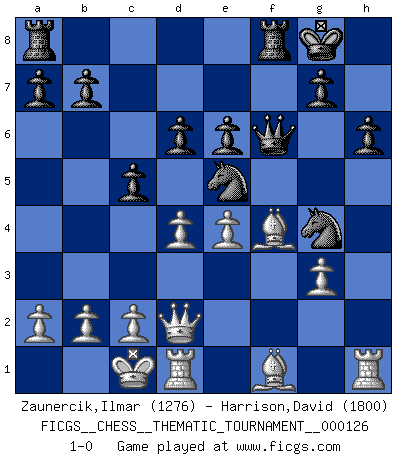 Last move : 1-0 2011 May 12 18:1:32 [Event "FICGS__CHESS__THEMATIC_TOURNAMENT__000126"] [Site "FICGS"] [Date "2011.02.08"] [Round "1"] [White "Zaunercik,Ilmar"] [Black "Harrison,David"] [Result "1-0"] [WhiteElo "1276"] [BlackElo "1800"] 1.e4 e5 2.f4 exf4 3.g3 fxg3 4.hxg3 d6 5.Nc3 Nf6 6.d3 Nc6 7.Bg5 Be7 8.Qd2 h6 9.Be3 O-O 10.O-O-O Ng4 11.Bf4 Bf6 12.Nd5 Be6 13.Nf3 Nce5 14.Nxf6+ Qxf6 15.Nd4 c5 16.Nxe6 fxe6 17.d4 1-0 This chess game has been lost on time (started : 2011.02.08 13:45:6) King's gambit accepted Kingside Castling by player Black (move 9) Queenside Castling by player White (move 10) Player White won this chess game. Follow this game move after move (download)The passed Pawn is a criminal, who should be kept under lock and key. Mild measures, such as police surveillance, are not sufficient. (Aaron Nimzovich) Die Idee von Capablanca, Schach als Fach in den Schulen zu lehren, ist großartig. (Fidel Castro) Yo creo que el Ajedrez posee una magia que es también una ayuda en la edad avanzada. Una rodilla reumática es olvidada durante una partida de Ajedrez y otros eventos pueden parecer algo sin importancia comparada a una catástrofe en el tablero de Ajedrez. (Vlastimil Hort) Le joueur d'Echecs qui veut atteindre le top est obligé de développer son propre credo créatif. Alexeï Stepanovicth Souétine. Il est facile d'écrire des livres ! Ce qui est difficile, c'est de jouer ! (Alexeï Stepanovicth Souétine) Knowledge will give you power, but character respect. (Bruce Lee)