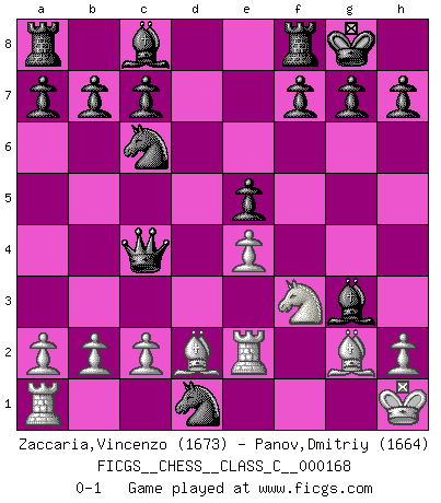 Last move : 0-1 2011 May 9 17:48:1 [Event "FICGS__CHESS__CLASS_C__000168"] [Site "FICGS"] [Date "2011.02.08"] [Round "1"] [White "Zaccaria,Vincenzo"] [Black "Panov,Dmitriy"] [Result "0-1"] [WhiteElo "1673"] [BlackElo "1664"] 1.e4 e5 2.Nf3 Nf6 3.d3 Nc6 4.g3 d5 5.Nbd2 dxe4 6.dxe4 Bc5 7.Bg2 Qe7 8.O-O O-O 9.Re1 Ng4 10.Nc4 Bxf2+ 11.Kh1 Bxg3 12.Re2 Nf2+ 13.Kg1 Nxd1 14.Bd2 Qc5+ 15.Kh1 Qxc4 0-1 This chess game has been lost on time (started : 2011.02.08 21:54:18) Petrov's defense Kingside Castling by player White (move 8) Kingside Castling by player Black (move 8) Player Black won this chess game. Follow this game move after move (download)Avoid the crowd. Do your own thinking independently. Be the Chess player, not the Chess piece. (Ralph Charell) Der 70jährige Viktor Kortschnoi: Die Rentenanstalt wollte mich zwingen in Rente zu gehen. Meine Frau erhält jetzt eine Pension- und ich zahle weiter in die Rentenkasse ein! (Viktor Kortschnoi) No es suficiente ser un buen jugador, se debe también de jugar bién. (Siegbert Tarrasch) Demandez au pauvre Cg1 ce qu'il en pense. Eduard Gufeld à propos de la variante Saemisch de l'Est-Indienne. Wisdom doesn't necessarily come with age. Sometimes age just shows up all by itself. (Tom Watson)
