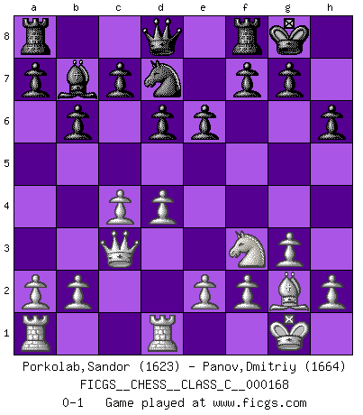 Last move : 0-1 2011 May 7 17:37:29 [Event "FICGS__CHESS__CLASS_C__000168"] [Site "FICGS"] [Date "2011.02.08"] [Round "1"] [White "Porkolab,Sandor"] [Black "Panov,Dmitriy"] [Result "0-1"] [WhiteElo "1623"] [BlackElo "1664"] 1.d4 Nf6 2.c4 e6 3.Nf3 Bb4+ 4.Bd2 Bxd2+ 5.Qxd2 O-O 6.g3 b6 7.Bg2 Bb7 8.O-O d6 9.Nc3 Ne4 10.Qc2 Nxc3 11.Qxc3 Nd7 12.Rfd1 h6 0-1 This chess game has been lost on time (started : 2011.02.08 21:54:18) Bogo-Indian defense Kingside Castling by player Black (move 5) Kingside Castling by player White (move 8) Player Black won this chess game. Follow this game move after move (download)The King is a fighting piece. Use it ! (Wilhelm Steinitz) Kombinieren und Schwarzhandel gehören verboten. (Savielly Grigorievitsch Tartakower) La estratégia requiere pensar, la táctica requiere observación. (Max Euwe) Seul un grand joueur sait à quel point il joue faiblement. (Xavier Tartacover) He who is a good ruler must first have been ruled. (Aristotle)