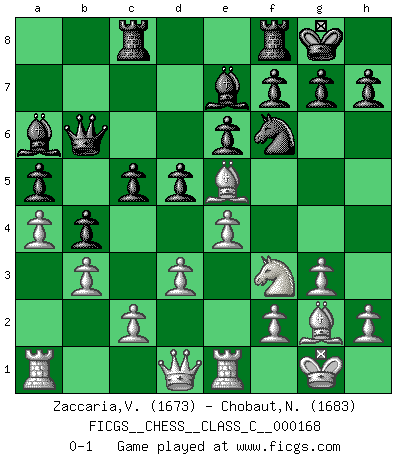 Last move : 0-1 2011 May 11 18:2:54 [Event "FICGS__CHESS__CLASS_C__000168"] [Site "FICGS"] [Date "2011.02.08"] [Round "1"] [White "Zaccaria,Vincenzo"] [Black "Chobaut,Nicolas"] [Result "0-1"] [WhiteElo "1673"] [BlackElo "1683"] 1.e4 c5 2.Nf3 e6 3.d3 Nc6 4.g3 d5 5.Nbd2 Nf6 6.Bg2 Be7 7.O-O O-O 8.b3 b5 9.Bb2 a5 10.a4 b4 11.Re1 Ba6 12.Ne5 Nxe5 13.Bxe5 Rc8 14.Nf3 Qb6 0-1 This chess game has been lost on time (started : 2011.02.08 21:54:18) Sicilian defense Kingside Castling by player White (move 7) Kingside Castling by player Black (move 7) Player Black won this chess game. Follow this game move after move (download)The Pin is mightier than the sword. (Fred Reinfeld) Viele Opfer benötigen überhaupt keine konkrete Berechnung. Es genügt sich die entstehende Position kurz vorzustellen, um uns davon zu überzeugen, dass das Opfer korrekt ist. (Mikhail Nekhemyevich Tal) De eso se trata el Ajedrez. Un día le das una lección a tu oponente y al día siguiente el te da una a tí. (Bobby Fischer) Toute estimation doit être constamment réévaluée. (Jacob Estrin) In theory there is no difference between theory and practice. In practice there is. (Yogi Berra)