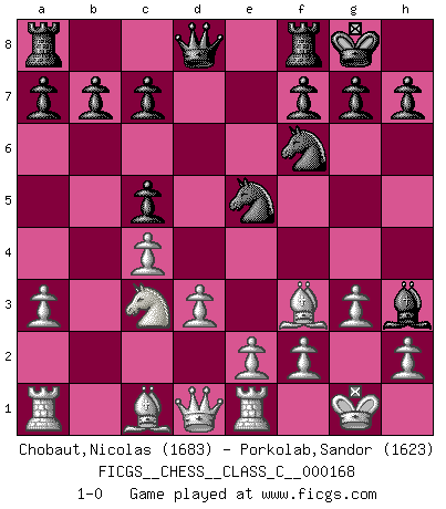 Last move : 1-0 2011 May 10 18:0:17 [Event "FICGS__CHESS__CLASS_C__000168"] [Site "FICGS"] [Date "2011.02.08"] [Round "1"] [White "Chobaut,Nicolas"] [Black "Porkolab,Sandor"] [Result "1-0"] [WhiteElo "1683"] [BlackElo "1623"] 1.c4 e5 2.g3 Nc6 3.Bg2 Nf6 4.Nf3 Bc5 5.O-O O-O 6.a3 d6 7.b4 e4 8.bxc5 exf3 9.Bxf3 dxc5 10.Nc3 Bh3 11.Re1 Ne5 12.d3 1-0 This chess game has been lost on time (started : 2011.02.08 21:54:18) English Opening Kingside Castling by player White (move 5) Kingside Castling by player Black (move 5) Player White won this chess game. Follow this game move after move (download)The essence of Chess is thinking about what Chess is. (David Bronstein) Jeder Schachmeister war einmal ein Anfänger. (Irving Chernev) La señal de un Gran Maestro es su habilidad de ganar una partida rápidamente y sin dolor. (Irving Chernev) Aucun coup ne doit être joué sans but. (Pedro Damiano) Experience is the name we all give to our mistakes. (Oscar Wilde)