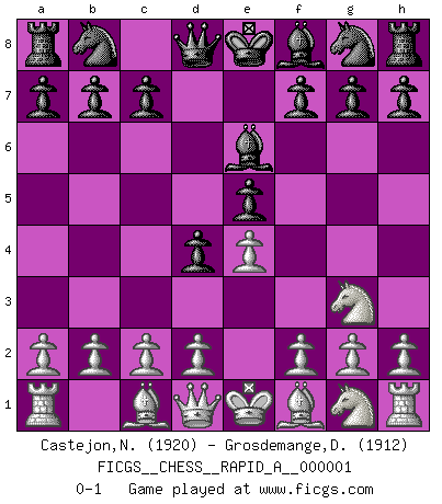 Last move : 0-1 2006 June 4 9:23:6 [Event "FICGS__CHESS__RAPID_A__000001"] [Site "FICGS"] [Date "2006.04.30"] [Round "1"] [White "Castejon,Nicolas"] [Black "Grosdemange,David"] [Result "0-1"] [WhiteElo "1920"] [BlackElo "1912"] 1.Nc3 d5 2.e4 d4 3.Nce2 e5 4.Ng3 Be6 0-1 This chess game has been lost on time (started : 2006.04.30 20:27:54) Dunst (Sleipner, Heinrichsen) Opening Player Black won this chess game. Follow this game move after move (download)A great player and a great example for many. His book My 60 Memorable Games had a big impact on me. It is a shame he didn't continue to enrich the world of chess with his unparalleled understanding after 1972. (Jan Timman, about Bobby Fischer's death) Mein Gehirn das ist mein zweitwichtigstes Organ [Aus dem Film: Der Schläfer]. (Woody Allen) No hay un Gran Maestro de Ajedrez que sea normal; solo se diferencían ellos por la magnitud de su locura. (Viktor Korchnoi) Karpov est une pièce de musée. (Garry Kasparov) Rules and bones are meant to be broken. (Anonymous)