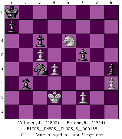 Last move : 0-1 2011 March 5 19:24:52 [Event "FICGS__CHESS__CLASS_B__000138"] [Site "FICGS"] [Date "2011.02.09"] [Round "1"] [White "Velasco,Jose Maria"] [Black "Friend,Reuben"] [Result "0-1"] [WhiteElo "1800"] [BlackElo "1914"] 1.e4 c6 2.d4 d5 3.Nc3 dxe4 4.Nxe4 Nf6 5.Nxf6+ gxf6 6.c3 h5 7.Bc4 Nd7 8.Nf3 Nb6 9.Bb3 h4 10.h3 Bf5 11.Qe2 Qd7 12.Bd2 O-O-O 13.a4 Nd5 14.a5 Bh6 15.Bxh6 Rxh6 16.Qd2 R6h8 17.c4 Nc7 18.O-O-O Ne6 19.Bc2 Bxc2 20.Qxc2 Nf4 21.Qe4 Qc7 22.a6 bxa6 23.Kb1 e6 24.Ne1 f5 25.Qf3 a5 26.Nc2 Kb8 27.Ne3 Ng6 28.c5 Ka8 29.Nc4 Rb8 30.Rd2 Rb4 31.Nd6 Rhb8 32.Rc1 a4 33.Rc4 Rb3 34.Rc3 Rxc3 35.Qxc3 Nf4 36.Qf3 Nd5 37.Kc1 Qa5 38.Nc4 Qa6 39.Nd6 Rb3 40.Qe2 Qxe2 41.Rxe2 Nf4 42.Re3 Nxg2 43.Rxb3 axb3 44.Nxf7 Nf4 45.Ng5 Nd3+ 46.Kd2 Nxb2 47.Nxe6 Nc4+ 0-1 Caro-Kann : Bronstein-Larsen variation Queenside Castling by player Black (move 12) Queenside Castling by player White (move 18) Player Black won this chess game. Follow this game move after move (download)That's what Chess is all about. One day you give your opponent a lesson, the next day he gives you one. (Bobby Fischer) Schach ist Krieg, im Schach geht es um testosterongesteuerte Urschreie. (Garry Kasparov) El Ajedrez es sobre todo, ¡una pelea!. (Emanuel Lasker) Il a essayé de se convaincre qu'il pourrait empêcher toutes les erreurs et ne jamais perdre. L'horreur ! Gary Kasparov au sujet de Robert Fischer. A married woman is like a fish riding a bicycle. (Rodolfo d'Ettorre)