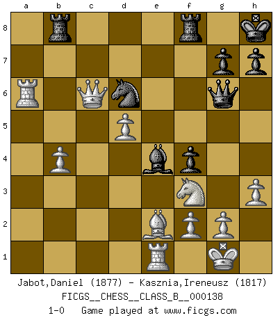 Last move : 1-0 2011 April 1 12:12:21 [Event "FICGS__CHESS__CLASS_B__000138"] [Site "FICGS"] [Date "2011.02.09"] [Round "1"] [White "Jabot,Daniel"] [Black "Kasznia,Ireneusz"] [Result "1-0"] [WhiteElo "1877"] [BlackElo "1817"] 1.e4 e5 2.Nf3 Nf6 3.Nxe5 d6 4.Nf3 Nxe4 5.d4 d5 6.Bd3 Nc6 7.O-O Be7 8.c4 Nb4 9.Be2 O-O 10.Nc3 Be6 11.Ne5 f6 12.Nf3 Kh8 13.a3 Nxc3 14.bxc3 Nc6 15.Nd2 Na5 16.cxd5 Qxd5 17.Bb2 Qd7 18.c4 Bf5 19.Re1 Rae8 20.Bc3 Nc6 21.Nf3 Be4 22.Qd2 Qg4 23.h3 Qg6 24.Nh4 Qf7 25.d5 Nd8 26.Qd4 Bd6 27.Qxa7 c6 28.Rad1 f5 29.Qb6 Be7 30.Nf3 Qg6 31.Bb4 Bxb4 32.axb4 Nf7 33.Qxb7 Ne5 34.Kf1 cxd5 35.cxd5 Nf7 36.Qc6 Nd6 37.Ra1 f4 38.Kg1 Rb8 39.Ra6 1-0 Petrov : Classical attack Kingside Castling by player White (move 7) Kingside Castling by player Black (move 9) Player White won this chess game. Follow this game move after move (download)Robert Fischer is a law unto himself. (Larry Evans) Glücklicherweise sind Großmeister Ruben Fines reine Schachbücher weniger phallozentrisch [als seine Schachpsychologie] und deswegen auch weniger lächerlich. (Nigel Short) ¿Que sería del Ajedrez sin errores graciosos?. (Kurt Richter) Shah mat. Le roi est mort. Cri de fierté d'un joueur venant de terrasser son adversaire, courtoisement, sans effusion de sang. This is where the fun begins. (Anakin Skywalker in Star Wars ep.3)