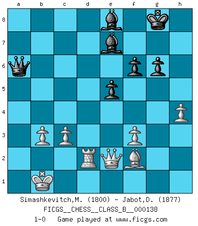 Last move : 1-0 2011 May 29 19:16:47 [Event "FICGS__CHESS__CLASS_B__000138"] [Site "FICGS"] [Date "2011.02.09"] [Round "1"] [White "Simashkevitch,Mykola"] [Black "Jabot,Daniel"] [Result "1-0"] [WhiteElo "1800"] [BlackElo "1877"] 1.e4 c5 2.Nf3 d6 3.d4 cxd4 4.Nxd4 Nf6 5.Nc3 g6 6.Be3 Bg7 7.f3 O-O 8.Qd2 Nc6 9.Bc4 Bd7 10.O-O-O Rc8 11.Bb3 Ne5 12.Kb1 Nc4 13.Bxc4 Rxc4 14.g4 b5 15.b3 Rc8 16.Ndxb5 Rb8 17.Nd4 a5 18.a4 Qc8 19.h4 h5 20.gxh5 Nxh5 21.Nd5 Re8 22.Qxa5 Qb7 23.Rhg1 e6 24.Nc7 Bxa4 25.Nxe8 Bxe8 26.Rg5 Ra8 27.Qc3 Qa7 28.Qb2 Bf6 29.Rg2 Qa6 30.c3 Qb7 31.Nc2 Rc8 32.Bd4 Be7 33.Nb4 d5 34.exd5 Nf4 35.Rgd2 Nxd5 36.Nxd5 Qxd5 37.Rd3 Qf5 38.Qe2 f6 39.Kb2 Ra8 40.Ra1 Rxa1 41.Kxa1 Qa5+ 42.Kb1 e5 43.Bf2 Qa6 44.Rd2 1-0 Sicilian : Dragon, Yugoslav attack, 7...O-O Kingside Castling by player Black (move 7) Queenside Castling by player White (move 10) Player White won this chess game. Follow this game move after move (download)No price is too great for the scalp of the enemy King. (Koblentz) Unter Putin wird alles Geld aus Russland wie von einem Staubsauger nach Moskau umgeleitet, das ist wie ein schwarzes Loch. (Garry Kasparov) El pensamiento metódico es mas útil en el Ajedrez que la inspiración. (C. J. S. Purdy) Avec des compensations pour le matériel en plus... (Anonyme) He who is a good ruler must first have been ruled. (Aristotle)