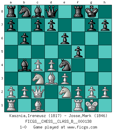 Last move : 1-0 2011 March 28 13:51:57 [Event "FICGS__CHESS__CLASS_B__000138"] [Site "FICGS"] [Date "2011.02.09"] [Round "1"] [White "Kasznia,Ireneusz"] [Black "Josse,Mark"] [Result "1-0"] [WhiteElo "1817"] [BlackElo "1846"] 1.d4 Nf6 2.c4 e6 3.Nc3 Bb4 4.e3 Ne4 5.Qc2 f5 6.Bd3 O-O 7.Nge2 b6 8.O-O 1-0 This chess game has been lost on time (started : 2011.02.09 12:54:42) Nimzo-Indian : 4.e3 Kingside Castling by player Black (move 6) Kingside Castling by player White (move 8) Player White won this chess game. Follow this game move after move (download)Suddenly it was obvious to me in my analysis I had missed what Fischer had found with the greatest of ease at the board. (Mikhail Botvinnik) Die größte Kunst beim Schach besteht darin dem Gegner nicht zu zeigen was er tun kann. (Garry Kasparov) Una clavada es mas poderosa que una espada. (Fred Reinfeld) Tout change constamment, y compris dans le monde des Echecs. (Botvinnik) O divine art of subtlety and secrecy! Through you we learn to be invisible, through you inaudible and hence we can hold the enemy's fate in our hands. (Sun Tzu)