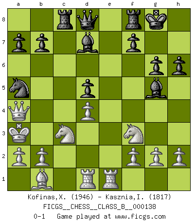 Last move : 0-1 2011 February 23 20:43:21 [Event "FICGS__CHESS__CLASS_B__000138"] [Site "FICGS"] [Date "2011.02.09"] [Round "1"] [White "Kofinas,Xristos"] [Black "Kasznia,Ireneusz"] [Result "0-1"] [WhiteElo "1946"] [BlackElo "1817"] 1.d4 Nf6 2.c4 e6 3.Nc3 d5 4.Bg5 Be7 5.e3 O-O 6.Nf3 h6 7.Bxf6 Bxf6 8.Qb3 c5 9.cxd5 cxd4 10.exd4 exd5 11.O-O-O Be6 12.Bd3 Nc6 13.Bb1 Rc8 14.Rhe1 Bg4 15.Qc2 g6 16.Qa4 Bg5+ 17.Kc2 Bf5+ 18.Kb3 Na5+ 19.Ka3 Bd7 0-1 Queen's pawn game Kingside Castling by player Black (move 5) Queenside Castling by player White (move 11) Player Black won this chess game. Follow this game move after move (download)Whoever sees no other aim in the game than that of giving checkmate to one's opponent will never become a good Chess player. (Euwe) Ich liebe den Moment, wenn ich das Ego meines Gegenüber breche. (Robert James Fischer) Creo que una cierta cantidad de temperamento es esperada de los genios del Ajedrez. (Ron Gross) Le moment que je préfère le plus dans une rencontre, c'est celui où je sens que la personnalité de l'adversaire se brise. (Robert Fischer) I would love to change the world, but they won't give me the source code. (Unknown)