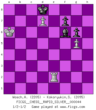 Last move : 1/2-1/2 2011 July 10 14:36:17 [Event "FICGS__CHESS__RAPID_SILVER__000044"] [Site "FICGS"] [Date "2011.02.11"] [Round "1"] [White "Wosch,Arkadiusz"] [Black "Kokoryukin,Sergey"] [Result "1/2-1/2"] [WhiteElo "2205"] [BlackElo "2095"] 1.e4 c5 2.Nf3 d6 3.d4 cxd4 4.Nxd4 Nf6 5.Nc3 a6 6.Be3 e5 7.Nb3 Be6 8.f3 Be7 9.Qd2 h5 10.O-O-O Nbd7 11.Kb1 Rc8 12.Nd5 Nxd5 13.exd5 Bf5 14.Bd3 Bxd3 15.Qxd3 Bg5 16.Bf2 Qc7 17.c3 b5 18.Rhg1 Bh6 19.h3 g6 20.g3 O-O 21.g4 hxg4 22.hxg4 Bf4 23.Nd2 Kg7 24.g5 Nc5 25.Bxc5 Qxc5 26.Ne4 Qb6 27.Rh1 Rh8 28.a3 a5 29.Ka2 Ra8 30.Qc2 Rab8 31.Rxh8 Rxh8 32.a4 bxa4 33.Qxa4 Rb8 34.Qc2 Qa6 35.Rh1 Qc4+ 36.b3 Qb5 37.Ka3 Rc8 38.c4 Qb4+ 39.Kb2 Ra8 40.Qc3 Qb6 41.c5 dxc5 42.Rh4 Qb4 43.Qxb4 cxb4 44.Rh1 Rd8 45.Rd1 Be3 46.d6 Bd4+ 47.Kc1 Rc8+ 48.Kb1 Rh8 49.Rc1 Bc3 50.Kc2 Bd4 51.Rd1 Rc8+ 52.Kd3 a4 53.bxa4 b3 54.d7 Rd8 55.Nf6 Kf8 56.Ke4 Ke7 57.f4 b2 58.fxe5 Rb8 59.Rb1 Bf2 60.a5 Rb3 61.a6 Ba7 62.Kd5 Rb6 63.Kc4 Kd8 64.Kc3 Bb8 65.Kd4 Re6 66.Kd5 Rxa6 67.Rxb2 Ra5+ 68.Kc6 Bxe5 69.Re2 Ra6+ 70.Kb5 Bxf6 71.Kxa6 1/2-1/2 Sicilian : Najdorf, Byrne (English) attack Queenside Castling by player White (move 10) Kingside Castling by player Black (move 20) 10 pieces endgame at move 68 : White KRNPP , Black KRBPP WHITE : King + 1 Rook 1 Knight 2 Pawns BLACK : King + 1 Rook 1 Bishop 2 Pawns 9 pieces endgame at move 70 : White KRPP , Black KRBPP WHITE : King + 1 Rook 2 Pawns BLACK : King + 1 Rook 1 Bishop 2 Pawns 8 pieces endgame at move 71 : White KRPP , Black KBPP WHITE : King + 1 Rook 2 Pawns BLACK : King + 1 Bishop 2 Pawns This chess game ended in a draw. Follow this game move after move (download)The mistakes are there, waiting to be made. (Savielly Tartakower) Sitze auf Deine Hände. (Siegbert Tarrasch) Un jugador que es sorprendido, esta derrotado a medias. (Proverbio) Karpov est une pièce de musée. (Garry Kasparov) Life is like internet, nothing interesting, but noone want to leave it. (Ilmars Cirulis)