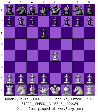 Last move : 0-1 2007 January 16 0:25:45 [Event "FICGS__CHESS__CLASS_E__000024"] [Site "FICGS"] [Date "2006.12.06"] [Round "1"] [White "Bandel,David"] [Black "El Desoukey,Ahmed"] [Result "0-1"] [WhiteElo "1400"] [BlackElo "1400"] 1.e4 d6 0-1 This chess game has been lost on time (started : 2006.12.06 19:25:10) King's pawn Opening Player Black won this chess game. Follow this game move after move (download)Examine moves that smite! A good eye for smites is far more important than a knowledge of strategical principles. (Purdy) Karpov ist ein Museumsstück. (Garry Kasparov) ¡Examina movidas que hagan daño! Un buen ojo for movidas desvastantes es mucho mas importante que el conocimiento de principios estratégicos. (Purdy) La tactique, c'est ce que vous faites quand il y a quelque chose à faire; la stratégie, c'est ce que vous faites quand il n'y a rien à faire. (Savielli Tartacower) Your best chance to get a Royal Flush in a casino is in the bathroom. (Anonymous)