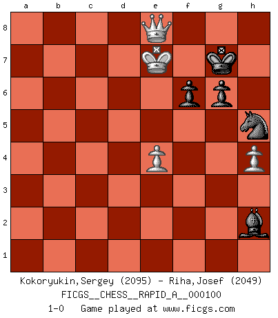 Last move : 1-0 2011 February 23 16:53:39 [Event "FICGS__CHESS__RAPID_A__000100"] [Site "FICGS"] [Date "2011.02.12"] [Round "1"] [White "Kokoryukin,Sergey"] [Black "Riha,Josef"] [Result "1-0"] [WhiteElo "2095"] [BlackElo "2049"] 1.d4 d5 2.c4 c6 3.Nf3 Nf6 4.Nc3 dxc4 5.a4 Bf5 6.Ne5 Nbd7 7.Nxc4 Qc7 8.g3 e5 9.dxe5 Nxe5 10.Bf4 Nfd7 11.Nxe5 Nxe5 12.Bg2 f6 13.a5 a6 14.O-O Be6 15.Qa4 O-O-O 16.Rfd1 Bc5 17.Ne4 Rxd1+ 18.Rxd1 Be7 19.Rc1 Rd8 20.Be3 Nd7 21.b4 Kb8 22.Qa1 h5 23.Qd4 Kc8 24.b5 axb5 25.a6 bxa6 26.Nd6+ Bxd6 27.Rxc6 Ne5 28.Rxc7+ Bxc7 29.Qa1 a5 30.f4 Nc4 31.Ba7 h4 32.gxh4 Bxf4 33.Qb1 Nd6 34.Bb6 Be5 35.Qc2+ Nc4 36.Bxd8 Kxd8 37.Qe4 Bd7 38.Qb7 a4 39.Bc6 Bxc6 40.Qxc6 Nd6 41.Qg2 Ne8 42.Qd5+ Nd6 43.Qg8+ Ne8 44.Qf8 Bd6 45.Qf7 a3 46.Kf2 Bxh2 47.Qd5+ Ke7 48.Qxb5 Nc7 49.Qc4 Bd6 50.Ke3 Ne6 51.Ke4 g6 52.Kd5 Nf4+ 53.Kc6 Be5 54.e3 Nh5 55.Qb4+ Kf7 56.Qxa3 Ng3 57.Qa7+ Kg8 58.Qb7 Nf5 59.Kd5 Ng7 60.e4 Kf8 61.Qc8+ Kf7 62.Kc6 Nh5 63.Kd7 Bh2 64.Qe8+ Kg7 65.Ke7 1-0 QGD Slav : Krause attack Kingside Castling by player White (move 14) Queenside Castling by player Black (move 15) 10 pieces endgame at move 48 : White KQPP , Black KBNPPP WHITE : King + 1 Queen 2 Pawns BLACK : King + 1 Bishop 1 Knight 3 Pawns 9 pieces endgame at move 56 : White KQPP , Black KBNPP WHITE : King + 1 Queen 2 Pawns BLACK : King + 1 Bishop 1 Knight 2 Pawns Player White won this chess game. Follow this game move after move (download)We don't really know how the game was invented, though there are suspicions. As soon as we discover the culprits, we'll let you know. (Bruce Pandolfini) Es hat in meinem Leben Zeiten gegeben, da ich sehr nahe daran war zu glauben, daß ich auch nicht eine einzige Schachpartie verlieren könnte. (José Raúl Capablanca) El jugador de combinación piensa hacia adelante; comienza de la posición dada y trabaja las movidas contundentes en su mente. (Emanuel Lasker) Dans le domaine de la peinture, de la gravure et de la sculpture, dès la première décennie de notre siècle, les artistes abandonnent la représentation de la partie d'échecs pour se concentrer sur les pièces, sur les échiquiers et sur toutes les variations auxquelles les unes et les autres peuvent donner lieu. On passe en quelque sorte d'un thème social à un thème musical (au sens de la musica médiévale, c'est-à-dire d'une notion qui inclue le rythme, l'harmonie, la construction et la déconstruction, etc.). Graphiquement et picturalement, l'échiquier apparaît comme une structure ouverte, dynamique, d'une richesse infinie, autorisant toutes les combinatoires et débouchant sur des mouvements et des rythmes de nature exponentielle. (Michel Pastoureau) Experience is the name we all give to our mistakes. (Oscar Wilde)