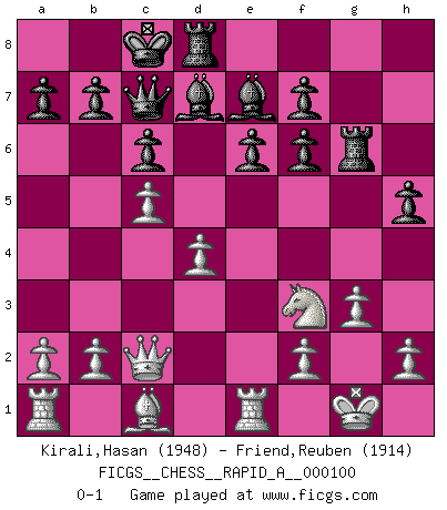 Last move : 0-1 2011 April 6 2:40:16 [Event "FICGS__CHESS__RAPID_A__000100"] [Site "FICGS"] [Date "2011.02.12"] [Round "1"] [White "Kirali,Hasan"] [Black "Friend,Reuben"] [Result "0-1"] [WhiteElo "1948"] [BlackElo "1914"] 1.e4 c6 2.d4 d5 3.Nc3 dxe4 4.Nxe4 Nf6 5.Nxf6+ gxf6 6.c3 h5 7.Nf3 Qc7 8.Bc4 Nd7 9.Qb3 e6 10.O-O Bd6 11.Re1 Nf8 12.Qc2 Ng6 13.Bd3 Rg8 14.g3 Bd7 15.c4 O-O-O 16.Bxg6 Rxg6 17.c5 Be7 0-1 This chess game has been lost on time (started : 2011.02.12 1:6:49) Caro-Kann : Bronstein-Larsen variation Kingside Castling by player White (move 10) Queenside Castling by player Black (move 15) Player Black won this chess game. Follow this game move after move (download)All I want to do, ever, is just play Chess. (Bobby Fischer) Fischer ist das größte Genie, das je vom Schachhimmel heruntergestiegen ist. (Mikhail Nekhemyevich Tal) Para mi, el Ajedrez es la vida y cada partida es como una nueva vida. Todo jugador de Ajedrez suele vivir muchas vidas durante su vida. (Eduard Gufeld) Je crois qu'il existe des manières très spécifiques de jouer efficacement contre une machine. Evidemment, nous n'avons aucune chance en technique pure, parce que l'ordinateur calcule de manière parfaite. Mais lorsque nous faisons appel à notre cerveau, en utilisant l'intuition et la compréhension, alors nous restons beaucoup plus forts. (Anatoli Karpov) 'preceded by its own quotation yields a falsehood' preceded by its own quotation yields a falsehood. (W. V. O. Quine - Set Theory And Its Logic, 1953)