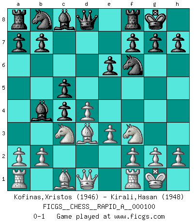 Last move : 0-1 2011 April 17 3:59:6 [Event "FICGS__CHESS__RAPID_A__000100"] [Site "FICGS"] [Date "2011.02.12"] [Round "1"] [White "Kofinas,Xristos"] [Black "Kirali,Hasan"] [Result "0-1"] [WhiteElo "1946"] [BlackElo "1948"] 1.d4 Nf6 2.c4 e6 3.Nc3 Bb4 4.e3 O-O 5.Bd3 d5 6.Nf3 c5 7.O-O dxc4 0-1 This chess game has been lost on time (started : 2011.02.12 1:6:49) Nimzo-Indian : 4.e3 O-O, 5.Bd3 d5 Kingside Castling by player Black (move 4) Kingside Castling by player White (move 7) Player Black won this chess game. Follow this game move after move (download)The laws of Chess do not permit a free choice: you have to move whether you like it or not. (Emanuel Lasker) Die Auseinandersetzung mit Karpow war politisch geprägt. Er stand für das kommunistische System, wurde von dessen Repräsentanten gehätschelt. Ich war der Oppositionelle. Jeder Schachweltmeister spiegelt auch die gesellschaftlichen Verhältnisse wider. Kramnik steht für die Börsen-Generation des Neuen Markts, ideologiefrei, zahlenfixiert. (Garry Kasparov) La vida es como un juego de Ajedrez, cambiando con cada movimiento. (Proverbio Chino) Ce n'est pas pour s'amuser qu'il joue aux échecs : il célèbre un culte. (Vladimir Nabokov) I don't believe in psychology. I believe in good moves. (Bobby Fischer)