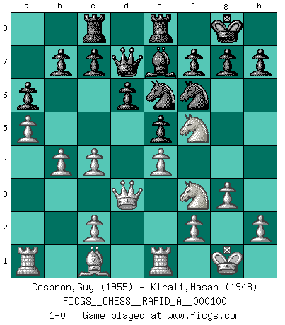 Last move : 1-0 2011 April 23 16:12:52 [Event "FICGS__CHESS__RAPID_A__000100"] [Site "FICGS"] [Date "2011.02.12"] [Round "1"] [White "Cesbron,Guy"] [Black "Kirali,Hasan"] [Result "1-0"] [WhiteElo "1955"] [BlackElo "1948"] 1.e4 e5 2.Nf3 Nc6 3.Bc4 Nf6 4.d3 Be7 5.O-O O-O 6.a4 d6 7.Re1 Be6 8.Nbd2 Qd7 9.Nf1 Rae8 10.Ng3 Bxc4 11.dxc4 Nd8 12.a5 a6 13.b4 Ne6 14.Qd3 Rc8 15.Nf5 Rfe8 16.g3 1-0 This chess game has been lost on time (started : 2011.02.12 1:6:49) Two knights defense (Modern Bishop's Opening) Kingside Castling by player White (move 5) Kingside Castling by player Black (move 5) Player White won this chess game. Follow this game move after move (download)The isolated Pawn casts gloom over the entire chessboard. (Aaron Nimzovich) Es gibt nur zwei wahre Schachgenies - das andere war Wilhelm Steinitz, der Weltmeister von 1872 bis 1894. (Robert James Fischer) El Ajedrez es el gimnasio de la mente. (Blaise Pascal) C'est une question de caractère, Beaucoup de gens perdent leur motivation très vite. D'autres, ils sont rares, peuvent la conserver très longtemps. J'aime les échecs, encore aujourd'hui je suis heureux d'analyser des parties. J'aime toujours gagner, je déteste encore perdre. Bien jouer est important pour mon intégrité intellectuelle et morale. Et puis les échecs vivent en ce moment une période historique grâce à Internet. Ils se développent dans les systèmes éducatifs à travers le monde. Ils sortent de leur ghetto, et c'est mon rôle de mener à bien cette révolution. (Gary Kasparov) Once you start thinking you have nothing left to learn, you have everything to learn. (Steve Badget)