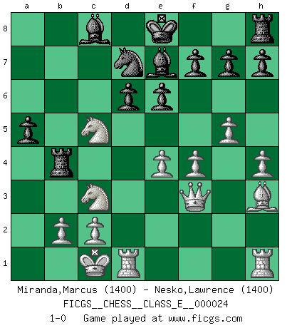 Last move : 1-0 2007 January 9 15:36:50 [Event "FICGS__CHESS__CLASS_E__000024"] [Site "FICGS"] [Date "2006.12.06"] [Round "1"] [White "Miranda,Marcus"] [Black "Nesko,Lawrence"] [Result "1-0"] [WhiteElo "1400"] [BlackElo "1400"] 1.e4 c5 2.Nf3 d6 3.d4 cxd4 4.Nxd4 Nf6 5.Nc3 a6 6.Bg5 e6 7.f4 Be7 8.Qf3 Qc7 9.O-O-O Nbd7 10.g4 b5 11.Bxf6 Nxf6 12.g5 Nd7 13.a3 Rb8 14.h4 b4 15.axb4 Rxb4 16.Bh3 Qc5 17.Nb3 a5 18.Nxc5 1-0 Sicilian : Najdorf, 7...Be7 Queenside Castling by player White (move 9) Player White won this chess game. Follow this game move after move (download)Chess is thirty to forty percent psychology. You don't have this when you play a computer. I can't confuse it. (Judith Polgar) Spielt Blackmar-Diemer-Gambit, und das Matt kommt von selbst! (Emil Joseph Diemer) Solo los afeminados hacen el Enroque. (Rob Sillars) Les échecs sont un jeu par leur forme, un art par leur essence et une science par sa difficulté d'acquisition. Ils peuvent vous procurer autant de plaisir qu'un bon livre ou une belle musique, mais vous n'aurez une réelle joie que si vous arrivez à bien jouer. (Tigran Petrosian) When you have everything, sometimes it feels like nothing. (Horatio Caine, C.S.I. Miami)