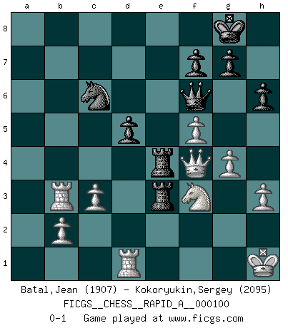 Last move : 0-1 2011 June 8 1:22:5 [Event "FICGS__CHESS__RAPID_A__000100"] [Site "FICGS"] [Date "2011.02.12"] [Round "1"] [White "Batal,Jean"] [Black "Kokoryukin,Sergey"] [Result "0-1"] [WhiteElo "1907"] [BlackElo "2095"] 1.Nf3 Nf6 2.g3 d5 3.Bg2 c6 4.O-O Bg4 5.d3 Nbd7 6.Nbd2 e5 7.e4 dxe4 8.dxe4 Bc5 9.h3 Bh5 10.Qe1 O-O 11.Nc4 Qe7 12.Nh4 Rfe8 13.Nf5 Qe6 14.Na5 b6 15.Nb3 Bg6 16.g4 Bf8 17.Qe2 Rad8 18.Be3 h6 19.a4 Bxf5 20.exf5 Qd6 21.a5 e4 22.axb6 axb6 23.Rfd1 Qe5 24.Nd4 Nb8 25.c3 Bd6 26.Kf1 Nd5 27.Bc1 Bc5 28.Ra7 Nf6 29.f4 exf3 30.Bxf3 Qg3 31.Qg2 Qe5 32.Qe2 Qd6 33.Qf2 Nd5 34.Qc2 b5 35.Rb7 Nd7 36.Nxb5 Qf6 37.Nd4 Ne5 38.Bxd5 cxd5 39.Rb3 Re7 40.Qf2 Rde8 41.Kg1 Nc6 42.Kh1 Re2 43.Qg3 Bd6 44.Bf4 Bxf4 45.Qxf4 R2e3 46.Nf3 R8e4 0-1 Reti Opening Kingside Castling by player White (move 4) Kingside Castling by player Black (move 10) Player Black won this chess game. Follow this game move after move (download)Chess is a forcing house where the fruits of character can ripen more fully than in life. (Edward Morgan Foster) Über Kasparov: Es ist offensichtlich, daß er in einem totalitären Staat aufwuchs und deshalb zu diktatorischen Zügen neigt. (Viktor Kortschnoi) La pasion por jugar al Ajedrez es una de las mas inexplicables en el mundo. (H.G. Wells) Il n'y a pas de prix trop élevé au scalp de l'ennemi. (Koblentz) Everybody lies. (Gregory House, House M.D.)