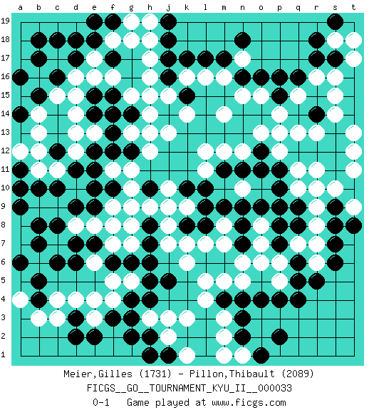 Last move : 0-1 2011 April 29 20:53:50 [Event "FICGS__GO__TOURNAMENT_KYU_II__000033"] [Site "FICGS"] [Date "2011.02.12"] [Round "1"] [Black "Meier,Gilles"] [White "Pillon,Thibault"] [Result "0-1"] [Rating 1 "1731"] [Rating 2 "2089"] 1.q16 d4 2.q4 d16 3.f3 r6 4.o4 r13 5.c6 f4 6.g4 f5 7.d3 e3 8.e2 e4 9.g2 c3 10.d2 g5 11.h4 c9 12.o16 s16 13.r17 q10 14.f17 h17 15.f15 d14 16.k17 h15 17.f13 d12 18.d18 c17 19.c18 l16 20.l17 m16 21.m17 k16 22.j16 j15 23.j17 h16 24.b17 m3 25.n3 m5 26.m4 l4 27.n4 k3 28.k15 k14 29.q8 r8 30.q6 q7 31.p7 r7 32.r5 p6 33.q5 o7 34.p8 n6 35.o9 o13 36.m9 k7 37.n11 f11 38.k10 h9 39.n16 m14 40.b4 c4 41.b5 b3 42.b8 b9 43.c8 d8 44.a6 a4 45.d7 e8 46.b7 m2 47.n2 n1 48.o1 m1 49.p2 l11 50.l10 h12 51.q9 r9 52.p10 o8 53.p9 q11 54.p11 p12 55.o12 n12 56.o11 m12 57.m11 l12 58.n8 n10 59.n7 o6 60.m6 m7 61.l6 m8 62.n9 l5 63.l8 l7 64.k8 k6 65.q12 p13 66.r12 r11 67.s11 r10 68.s13 q13 69.s12 s14 70.r14 s15 71.s6 s10 72.s7 t11 73.s8 t13 74.h5 k9 75.j9 j8 76.l9 j10 77.h8 k9 78.s9 t12 79.j9 j7 80.h10 k9 81.g6 j9 82.f6 b16 83.b18 e6 84.e7 f7 85.d6 g7 86.h6 h18 87.j18 e17 88.e18 f16 89.d17 e16 90.c16 c15 91.b15 b14 92.a16 s18 93.r18 f18 94.s17 t17 95.h7 g8 96.a14 b13 97.a9 a10 98.g9 f8 99.d9 f9 100.c10 b11 101.b10 q15 102.p15 p14 103.f10 g10 104.e10 o15 105.p16 n15 106.e11 g11 107.e12 j2 108.e15 d15 109.c12 e13 110.e14 d13 111.f12 c11 112.h13 j13 113.g12 h3 114.h2 j3 115.g3 g15 116.f14 h14 117.a11 a12 118.d11 a10 119.e9 g9 120.a11 b12 121.s19 t18 122.f19 g18 123.j1 k1 124.h1 r16 125.j5 p5 126.p4 g13 127.j19 t9 128.t8 n5 129.g14 h13 130.a10 g19 131.e19 h19 132.t10 n17 133.n18 t9 0-1 Here are the names of the openings (joseki) played in the four corners : Corner d4 : d4 f3 Hoshi (Hwajeom, Seongjeom, Xingwei`) 4-4 Point. The star or hoshi (4-4) point, emphasizing influence at the potential expense of territory. Ikken Kakari (Hankan Keolch'im, Yi Gua`jiao~, 1-Space Low Approach). Black 2 is the standard approach move to the 4-4. Corner q4 : q4 r6 Hoshi (Hwajeom, Seongjeom, Xingwei`) 4-4 Point. The star or hoshi (4-4) point, emphasizing influence at the potential expense of territory. Ikken Kakari (Hankan Keolch'im, Yi Gua`jiao~, 1-Space Low Approach). White 2 is the standard approach move to the 4-4. Corner q16 : q16 r13 Hoshi (Hwajeom, Seongjeom, Xingwei`) 4-4 Point. The star or hoshi (4-4) point, emphasizing influence at the potential expense of territory. Niken Kakari (Dukan Keolch'im, E`r Gua`jiao~, 2-Space Low Approach). Black typically answers by 7-3 or 3-5 (which is not joseki). Corner d16 : d16 f17 Hoshi (Hwajeom, Seongjeom, Xingwei`) 4-4 Point. The star or hoshi (4-4) point, emphasizing influence at the potential expense of territory. Ikken Kakari (Hankan Keolch'im, Yi Gua`jiao~, 1-Space Low Approach). Black 2 is the standard approach move to the 4-4. Player White won this Go (weiqi, baduk) game. Follow this game move after move (download)Sacrifice for shape. (Anonymous) Luck is when opportunity knocks and you answer. (Anonymous)
