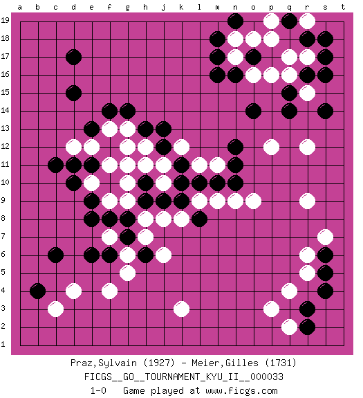 Last move : 1-0 2011 February 17 21:54:11 [Event "FICGS__GO__TOURNAMENT_KYU_II__000033"] [Site "FICGS"] [Date "2011.02.12"] [Round "1"] [Black "Praz,Sylvain"] [White "Meier,Gilles"] [Result "1-0"] [Rating 1 "1927"] [Rating 2 "1731"] 1.r16 d4 2.d17 q4 3.c6 f4 4.c11 p16 5.q14 r17 6.s17 q17 7.m16 n17 8.m17 n18 9.m18 r12 10.s14 r9 11.s18 p3 12.s4 r5 13.s5 r6 14.r3 q2 15.r2 k3 16.d15 p12 17.o14 p18 18.n16 o16 19.n12 o9 20.e6 g6 21.g7 h7 22.g8 h8 23.h6 g5 24.h9 k8 25.j9 j8 26.k9 f7 27.f6 g9 28.f8 f9 29.e8 g11 30.l8 j6 31.j12 l9 32.l10 m9 33.e9 e10 34.e11 f11 35.d10 e12 36.f10 g10 37.g14 j11 38.k11 j10 39.k10 h12 40.h10 h11 41.j13 k12 42.h13 l11 43.m10 m11 44.n10 n9 45.n11 f13 46.f12 e10 47.d11 g13 48.e13 d12 49.f10 r15 50.q15 e10 51.f14 g12 52.b4 c3 53.s6 s7 54.o17 o18 55.q19 q16 56.s16 p19 57.n19 r19 58.r18 1-0 Here are the names of the openings (joseki) played in the four corners : Corner d4 : d4 c6 Hoshi (Hwajeom, Seongjeom, Xingwei`) 4-4 Point. The star or hoshi (4-4) point, emphasizing influence at the potential expense of territory. Ikken Kakari (Hankan Keolch'im, Yi Gua`jiao~, 1-Space Low Approach). Black 2 is the standard approach move to the 4-4. Corner q16 : r16 p16 Komoku (Somok, Xiao~mu`) 3-4 Point. The komoku (3-4) point is the traditional corner enclosure move.. Ikken Takagakari (Hankan Nop'dakeolch'im, Yi Gaogua`jiao~, 1-Space High Approach). The 5-4 approach move has become more popular in modern times, as modern Go emphasizes speed and influence. Player Black won this Go (weiqi, baduk) game. Follow this game move after move (download)A knight's move near the edge of the board cannot be cut. (Bill Taylor) A bird doesn't sing because it has an answer, it sings because it has a song. (Maya Angelou)