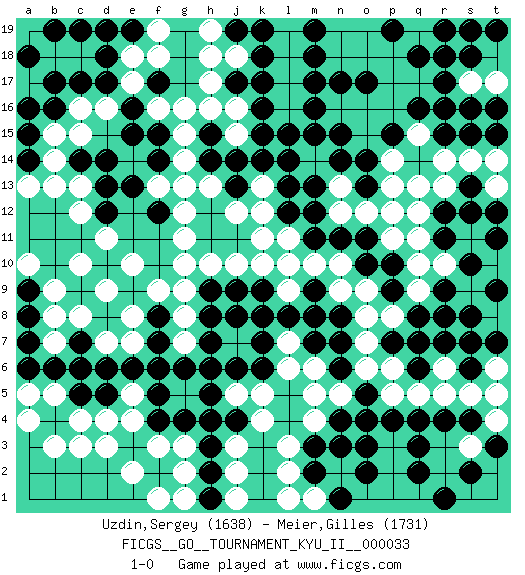 Last move : 1-0 2011 May 14 11:4:10 [Event "FICGS__GO__TOURNAMENT_KYU_II__000033"] [Site "FICGS"] [Date "2011.02.12"] [Round "1"] [Black "Uzdin,Sergey"] [White "Meier,Gilles"] [Result "1-0"] [Rating 1 "1638"] [Rating 2 "1731"] 1.q16 d4 2.q4 d16 3.k16 k4 4.d10 r6 5.r8 p6 6.o4 q9 7.r9 q10 8.r11 r10 9.s10 q11 10.r12 q12 11.m3 l3 12.q14 h17 13.c14 c15 14.d14 c8 15.e16 e17 16.c17 c16 17.d17 e18 18.b16 b15 19.b17 b14 20.d18 f16 21.e15 c13 22.d13 c12 23.d12 c10 24.h3 f3 25.h5 m4 26.n3 l2 27.b4 c3 28.c6 d9 29.e6 d11 30.f15 g16 31.k18 l6 32.j14 r13 33.s13 r14 34.r15 s14 35.s12 q13 36.s15 b3 37.q8 p8 38.p9 o9 39.p7 o8 40.q6 q5 41.r7 o7 42.q7 p5 43.r4 r5 44.s6 s5 45.s7 e10 46.s4 t5 47.p4 g15 48.f12 g10 49.h7 g12 50.g13 h13 51.h12 g11 52.h14 g14 53.j13 f13 54.f14 h13 55.p10 g13 56.o11 o12 57.n11 p11 58.o10 n12 59.m11 p14 60.j8 k10 61.l8 j7 62.h9 k11 63.m12 n13 64.l13 j12 65.n15 q15 66.p15 o15 67.q14 o16 68.k6 k5 69.j6 j5 70.h6 h4 71.g4 g3 72.j4 j3 73.h4 j2 74.n6 o6 75.m7 n5 76.o5 l7 77.m9 m6 78.n7 k8 79.k9 m8 80.n8 n9 81.m8 m10 82.k7 l14 83.k14 n10 84.l15 m14 85.m13 l10 86.o14 q15 87.j11 k12 88.n14 p16 89.r17 r16 90.s16 q17 91.q18 p17 92.n17 p18 93.s18 q19 94.o13 p12 95.r18 n16 96.m16 n18 97.m18 n19 98.p19 o19 99.o17 r16 100.h11 h10 101.q16 p13 102.m15 r16 103.j9 j10 104.q16 o18 105.m17 r16 106.f17 f18 107.q16 t13 108.t11 r16 109.h2 g2 110.q16 t14 111.t12 r16 112.e3 e4 113.q16 s9 114.t9 r16 115.f4 e2 116.q16 t8 117.s8 r16 118.f2 f1 119.q16 t17 120.r16 r19 121.s19 t18 122.p19 q19 123.m19 t16 124.t15 s17 125.b19 o1 126.q2 t4 127.s2 p2 128.t3 l9 129.k8 g8 130.f7 g7 131.g6 e5 132.f5 d7 133.d6 b5 134.b6 a5 135.c5 c4 136.a9 b9 137.a8 a10 138.a6 a4 139.m2 m1 140.o2 p3 141.q3 q1 142.r1 p1 143.n1 n2 144.o3 e7 145.h1 j1 146.f8 g9 147.a15 f9 148.a14 a13 149.a16 e8 150.f6 b7 151.c7 b8 152.a7 j18 153.j17 j16 154.k17 h18 155.e19 d19 156.c19 f19 157.j19 h19 158.k19 j15 159.h15 h16 160.k15 t6 161.t7 g1 162.d19 k13 163.n1 l1 164.n4 m5 165.l12 l11 166.t19 t17 167.h8 s17 168.a18 t18 169.d5 pass 170.e13 b13 171.l14 d3 172.t16 t17 173.r19 s17 174.p19 s3 175.p15 1-0 Here are the names of the openings (joseki) played in the four corners : Corner q4 : q4 r6 Hoshi (Hwajeom, Seongjeom, Xingwei`) 4-4 Point. The star or hoshi (4-4) point, emphasizing influence at the potential expense of territory. Ikken Kakari (Hankan Keolch'im, Yi Gua`jiao~, 1-Space Low Approach). White 2 is the standard approach move to the 4-4. Player Black won this Go (weiqi, baduk) game. Follow this game move after move (download)The carpenter's square becomes ko. (Anonymous) All war is based on deception. (Sun Tzu)