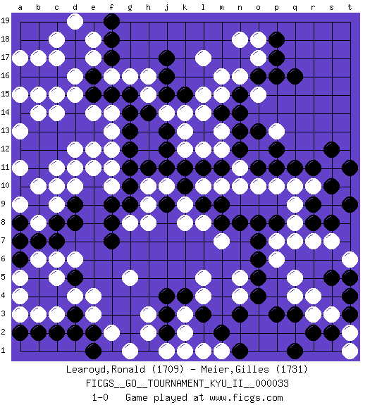 Last move : 1-0 2011 May 13 0:30:44 [Event "FICGS__GO__TOURNAMENT_KYU_II__000033"] [Site "FICGS"] [Date "2011.02.12"] [Round "1"] [Black "Learoyd,Ronald"] [White "Meier,Gilles"] [Result "1-0"] [Rating 1 "1709"] [Rating 2 "1731"] 1.q16 d4 2.q3 d16 3.r9 d10 4.j4 q5 5.o4 r3 6.r2 r4 7.s2 r7 8.o6 o17 9.o16 n16 10.p17 o15 11.p16 o18 12.p8 q4 13.p3 s3 14.n15 m15 15.n14 m16 16.m14 l14 17.l13 m13 18.n13 m12 19.n12 n11 20.m11 l12 21.l11 k12 22.o11 n10 23.l9 o10 24.p11 p10 25.q11 l10 26.k10 m10 27.k11 q10 28.r11 r10 29.s10 s11 30.s12 s9 31.t11 q9 32.r8 q8 33.s8 s7 34.t9 p7 35.o7 p6 36.o8 k9 37.j9 k8 38.j12 k13 39.j13 j14 40.h11 j10 41.j11 h10 42.g10 h9 43.g9 h8 44.g13 g16 45.h14 h15 46.j15 k14 47.g15 h16 48.f15 f16 49.e15 f12 50.g12 f11 51.g11 d15 52.e16 e17 53.d14 e14 54.e13 f14 55.g14 f13 56.d13 g8 57.f8 f10 58.f9 g5 59.d8 c6 60.c10 c11 61.d11 d12 62.c12 e11 63.b11 d11 64.d9 b10 65.b13 c9 66.c8 c14 67.c13 b15 68.b9 a11 69.b12 c10 70.d17 c17 71.d18 c18 72.c16 c15 73.b16 b17 74.a16 a15 75.a12 b8 76.b7 a9 77.c7 a17 78.a7 b14 79.a8 e12 80.a10 o12 81.o13 a11 82.f17 e18 83.a10 p13 84.p12 a11 85.j16 a13 86.j17 l17 87.p18 n18 88.f18 d19 89.f19 n5 90.o5 l5 91.l3 h3 92.j3 h2 93.m8 l8 94.m9 m7 95.n8 n4 96.n3 l1 97.m2 k2 98.j2 j1 99.b4 b3 100.c4 c3 101.d5 c5 102.d3 e4 103.b5 d6 104.d2 b6 105.a6 e3 106.b2 a3 107.c2 a5 108.a2 a4 109.e2 f2 110.e1 k3 111.k4 l4 112.k15 l15 113.s5 q7 114.t5 t6 115.t3 t2 116.t4 t1 117.q1 m1 118.n1 k1 119.h1 g1 120.f7 1-0 Here are the names of the openings (joseki) played in the four corners : Corner d4 : d4 j4 Hoshi (Hwajeom, Seongjeom, Xingwei`) 4-4 Point. The star or hoshi (4-4) point, emphasizing influence at the potential expense of territory. Corner q16 : q16 o17 Hoshi (Hwajeom, Seongjeom, Xingwei`) 4-4 Point. The star or hoshi (4-4) point, emphasizing influence at the potential expense of territory. Ikken Kakari (Hankan Keolch'im, Yi Gua`jiao~, 1-Space Low Approach). White 2 is the standard approach move to the 4-4. Corner d16 : d16 j12 Hoshi (Hwajeom, Seongjeom, Xingwei`) 4-4 Point. The star or hoshi (4-4) point, emphasizing influence at the potential expense of territory. Player Black won this Go (weiqi, baduk) game. Follow this game move after move (download)Win the early ko to win the game. (Anonymous) He who laughs last probably does not get the joke. (Unknown)