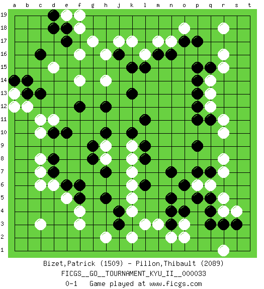 Last move : 0-1 2011 June 7 14:23:45 [Event "FICGS__GO__TOURNAMENT_KYU_II__000033"] [Site "FICGS"] [Date "2011.02.12"] [Round "1"] [Black "Bizet,Patrick"] [White "Pillon,Thibault"] [Result "0-1"] [Rating 1 "1509"] [Rating 2 "2089"] 1.q3 r16 2.c16 c3 3.p17 r5 4.q5 q6 5.p5 r4 6.r3 p6 7.j3 r10 8.e17 c10 9.c13 k17 10.p15 q14 11.p14 q13 12.p13 g17 13.p12 q12 14.p11 n17 15.q11 r11 16.p9 f3 17.m16 m17 18.n16 o3 19.n5 l3 20.n3 k4 21.j4 n2 22.o4 m3 23.n4 o2 24.q4 k5 25.h5 c6 26.h7 k7 27.f6 e5 28.e6 d6 29.f5 f4 30.d7 c7 31.d8 c8 32.d10 d11 33.e10 c11 34.n7 k9 35.l11 k2 36.k15 h14 37.k13 r18 38.l6 k6 39.h10 f18 40.e18 h2 41.l8 k8 42.l9 b12 43.b13 e19 44.d19 f19 45.d18 a13 46.a14 a12 47.b14 r8 48.k10 f14 49.s3 s4 50.p7 r1 51.q7 r7 52.j16 j17 53.q15 r15 54.o6 h16 55.h12 o18 56.o17 l16 57.l15 h9 58.g9 h8 59.g8 f16 60.f12 d15 0-1 Here are the names of the openings (joseki) played in the four corners : Corner q16 : r16 p17 Komoku (Somok, Xiao~mu`) 3-4 Point. The komoku (3-4) point is the traditional corner enclosure move.. Ikken Kakari (Hankan Keolch'im, Yi Gua`jiao~, 1-Space Low Pincer). The small knight move is the basic approach move to the 3-4 point stone. It has been continually used for over four centuries. There are limitless variations, with new moves constantly being discovered. Black 2 opens the door to a treaure store of joseki. Corner q4 : q3 r5 Komoku (Somok, Xiao~mu`) 3-4 Point. The komoku (3-4) point is the traditional corner enclosure move.. Ikken Kakari (Hankan Keolch'im, Yi Gua`jiao~, 1-Space Low Pincer). The small knight move is the basic approach move to the 3-4 point stone. It has been continually used for over four centuries. There are limitless variations, with new moves constantly being discovered. White 2 opens the door to a treaure store of joseki. Corner d4 : c3 j3 San-San (Sam-Sam, San-San) 3-3 Point. The San-San (3-3) point, emphasizing territory at the expense of influence. Player White won this Go (weiqi, baduk) game. Follow this game move after move (download)With only one group, you will win. (Anonymous) A woman without a man is like a fish without a bicycle. (Gloria Steinem)