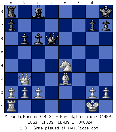 Last move : 1-0 2006 December 19 10:56:10 [Event "FICGS__CHESS__CLASS_E__000024"] [Site "FICGS"] [Date "2006.12.06"] [Round "1"] [White "Miranda,Marcus"] [Black "Forlot,Dominique"] [Result "1-0"] [WhiteElo "1400"] [BlackElo "1459"] 1.e4 e5 2.Nf3 Nc6 3.Bb5 Nf6 4.O-O Bc5 5.Nxe5 Nxe5 6.d4 Bd6 7.dxe5 Bxe5 8.f4 Nxe4 9.fxe5 c6 10.Qf3 f5 11.Bd3 O-O 12.Bxe4 fxe4 13.Qb3+ Kh8 14.Rxf8+ Qxf8 15.Be3 d5 16.exd6 Qxd6 17.Nd2 b6 18.Nxe4 1-0 Ruy Lopez : Berlin defense, Beverwijk variation Kingside Castling by player White (move 4) Kingside Castling by player Black (move 11) Player White won this chess game. Follow this game move after move (download)In Chess, just as in life, today's bliss may be tomorrow's poison. (Assaic) Mit Schach schule ich mein Gefühl für Geometrie, was für Tennis und Schach gleichermaßen wichtig ist. (Boris Becker) Los libros de Ajedrez deben de usarse igual como usamos los anteojos: para mejorar la vista, aunque algunos jugadores los quieren usar como si ellos les otorgaran la vision. (José Raúl Capablanca) On n'a jamais que l'âge auquel on a commence à jouer aux échecs car après on cesse de vieillir. (Capablanca) There will be no order, only chaos. (Sol Robeson in Pi by Darren Aronofsky)