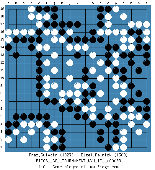 Last move : 1-0 2011 September 20 14:27:52 [Event "FICGS__GO__TOURNAMENT_KYU_II__000033"] [Site "FICGS"] [Date "2011.02.12"] [Round "1"] [Black "Praz,Sylvain"] [White "Bizet,Patrick"] [Result "1-0"] [Rating 1 "1927"] [Rating 2 "1509"] 1.r16 c16 2.e16 d3 3.d5 r4 4.p4 p16 5.n17 n16 6.m16 o17 7.n15 o16 8.m15 r15 9.s15 r17 10.s16 s17 11.r13 j16 12.c15 d16 13.d15 e17 14.f17 f16 15.e15 f18 16.g17 e18 17.g18 b16 18.b15 a15 19.a14 a16 20.b13 q16 21.f4 f3 22.g3 e4 23.e5 g4 24.f5 g2 25.h3 f2 26.h2 d4 27.c5 c4 28.q6 r6 29.r7 q5 30.p5 g16 31.j17 h15 32.k17 g13 33.e12 g11 34.e10 g9 35.e8 j8 36.j6 m6 37.l7 m7 38.l8 n8 39.s6 r5 40.q7 s7 41.s8 s5 42.t7 q3 43.p3 q2 44.p2 p1 45.o1 q1 46.n2 n10 47.l10 n12 48.p14 m13 49.k13 p9 50.q10 p10 51.q11 p12 52.p11 o11 53.o13 m11 54.l11 j10 55.n18 o18 56.j7 h8 57.g7 j12 58.l5 m5 59.m4 f10 60.e9 f12 61.e13 r14 62.s14 q15 63.b4 b3 64.b5 n4 65.n3 o5 66.a3 a2 67.a4 c2 68.o12 q9 69.r9 l14 70.h17 l9 71.m9 k9 72.m8 l6 73.k5 k7 74.k15 k14 75.j15 j14 76.h16 g15 77.o19 p19 78.n19 q18 79.g1 f1 80.h1 o6 81.l15 p13 82.o14 s13 83.r12 s12 84.s11 q14 85.q13 t16 86.t13 t15 87.t12 p7 88.t5 t4 89.t6 s3 90.f19 d18 91.t14 t17 92.k6 k8 93.o4 f8 94.f7 f14 95.e11 e14 96.d14 f9 97.e19 d19 98.g19 h7 99.h6 q8 100.n5 1-0 Here are the names of the openings (joseki) played in the four corners : Corner d16 : c16 e16 Komoku (Somok, Xiao~mu`) 3-4 Point. The komoku (3-4) point is the traditional corner enclosure move.. Ikken Takagakari (Hankan Nop'dakeolch'im, Yi Gaogua`jiao~, 1-Space High Approach). The 5-4 approach move has become more popular in modern times, as modern Go emphasizes speed and influence. Corner d4 : d3 d5 Komoku (Somok, Xiao~mu`) 3-4 Point. The komoku (3-4) point is the traditional corner enclosure move.. Ikken Takagakari (Hankan Nop'dakeolch'im, Yi Gaogua`jiao~, 1-Space High Approach). The 5-4 approach move has become more popular in modern times, as modern Go emphasizes speed and influence. Corner q4 : r4 p4 Komoku (Somok, Xiao~mu`) 3-4 Point. The komoku (3-4) point is the traditional corner enclosure move.. Ikken Takagakari (Hankan Nop'dakeolch'im, Yi Gaogua`jiao~, 1-Space High Approach). The 5-4 approach move has become more popular in modern times, as modern Go emphasizes speed and influence. Corner q16 : r16 p16 Komoku (Somok, Xiao~mu`) 3-4 Point. The komoku (3-4) point is the traditional corner enclosure move.. Ikken Takagakari (Hankan Nop'dakeolch'im, Yi Gaogua`jiao~, 1-Space High Approach). The 5-4 approach move has become more popular in modern times, as modern Go emphasizes speed and influence. Player Black won this Go (weiqi, baduk) game. Follow this game move after move (download)Do not make moves that strengthen your opponent ! (Anonymous) There are two kinds of people in the world, my friend. Those who have a loaded gun and those who dig. You dig ! (Blondie in The Good, The Bad and The Ugly)