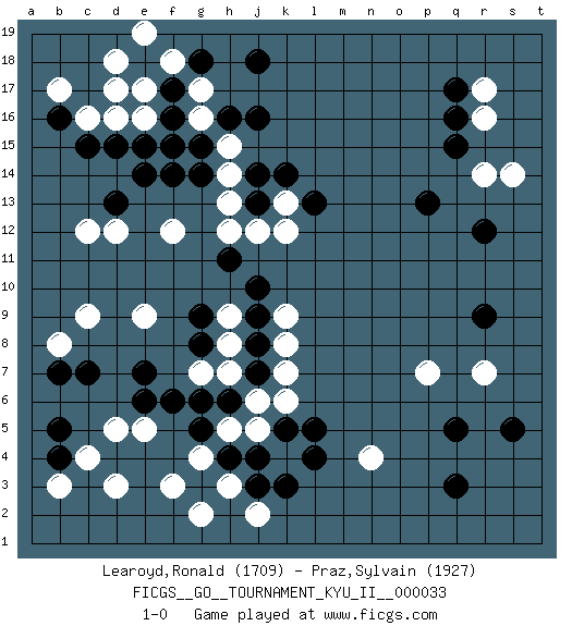 Last move : 1-0 2011 May 4 21:58:39 [Event "FICGS__GO__TOURNAMENT_KYU_II__000033"] [Site "FICGS"] [Date "2011.02.12"] [Round "1"] [Black "Learoyd,Ronald"] [White "Praz,Sylvain"] [Result "1-0"] [Rating 1 "1709"] [Rating 2 "1927"] 1.q16 d17 2.q3 d3 3.r9 n4 4.q5 k4 5.d15 d12 6.g15 g17 7.j16 d5 8.c7 c9 9.e7 e9 10.b5 c4 11.b4 b3 12.g6 g4 13.g9 f12 14.h11 h13 15.k14 k13 16.j13 j12 17.j14 h12 18.l13 k12 19.j18 c16 20.c15 f15 21.f16 g16 22.f14 h15 23.g14 h14 24.e14 e16 25.e15 d16 26.b16 b17 27.d13 c12 28.f17 f18 29.e18 e17 30.f15 d18 31.g18 e19 32.h16 k9 33.h4 h3 34.g3 f3 35.j3 g2 36.j4 j2 37.k3 h5 38.g5 j5 39.k5 k6 40.l5 h7 41.l4 g7 42.e6 b8 43.b7 e5 44.f6 r14 45.r12 r17 46.q17 r16 47.q15 s14 48.p13 r7 49.s5 p7 50.h6 j6 51.j7 k7 52.j8 k8 53.g8 h8 54.j9 h9 55.j10 1-0 Here are the names of the openings (joseki) played in the four corners : Corner d16 : d17 d15 Komoku (Somok, Xiao~mu`) 3-4 Point. The komoku (3-4) point is the traditional corner enclosure move.. Ikken Takagakari (Hankan Nop'dakeolch'im, Yi Gaogua`jiao~, 1-Space High Approach). The 5-4 approach move has become more popular in modern times, as modern Go emphasizes speed and influence. Player Black won this Go (weiqi, baduk) game. Follow this game move after move (download)Be a little patient. Keshi works ! (Anonymous) Be who you are, and say what you feel because those who mind don't matter, and those who matter don't mind. (Dr Seuss)