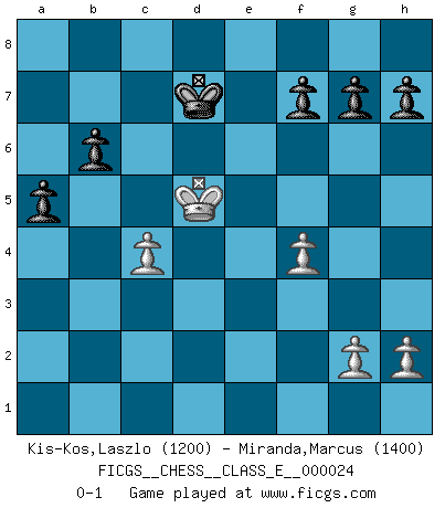 Last move : 0-1 2007 January 3 6:53:14 [Event "FICGS__CHESS__CLASS_E__000024"] [Site "FICGS"] [Date "2006.12.06"] [Round "1"] [White "Kis-Kos,Laszlo"] [Black "Miranda,Marcus"] [Result "0-1"] [WhiteElo "1200"] [BlackElo "1400"] 1.e4 e5 2.Nf3 Nc6 3.Bc4 Bc5 4.b4 Bxb4 5.c3 Be7 6.d4 Na5 7.Nxe5 Nxc4 8.Nxc4 d5 9.exd5 Qxd5 10.Ne3 Qd8 11.O-O Nf6 12.Ba3 Bxa3 13.Nxa3 Be6 14.Re1 O-O 15.c4 c6 16.Rc1 Qa5 17.Qb3 Qb6 18.Rcd1 Rfd8 19.d5 Qxb3 20.axb3 cxd5 21.cxd5 Nxd5 22.Nxd5 Rxd5 23.Rxd5 Bxd5 24.Nc4 Bxc4 25.bxc4 Kf8 26.Kf1 Rc8 27.Re4 a6 28.Ke2 Re8 29.Kd3 Rxe4 30.Kxe4 Ke7 31.Ke5 Kd7 32.Kd5 b6 33.f4 a5 0-1 Evans gambit : Cordel variation Kingside Castling by player White (move 11) Kingside Castling by player Black (move 14) Player Black won this chess game. Follow this game move after move (download)Winning isn't everything... but losing is nothing. (Mednis) Schach ist ein Kampf gegen den Fehler. (Johannes Herrman Zukertort) Tu no necesitas jugar muy bien, únicamente ayudar a tu oponenet a que juegue muy mal. (Genrikh Chepukaitis) Je ne crois pas en la psychologie, je crois aux bons coups. (Robert Fischer) Man is reluctant to give credit for intelligence to anyone, except his enemies. (Albert Einstein)