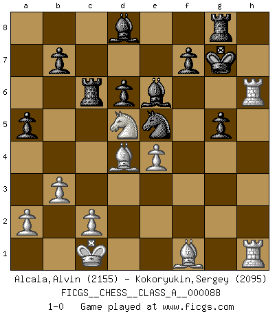 Last move : 1-0 2011 December 16 4:35:14 [Event "FICGS__CHESS__CLASS_A__000088"] [Site "FICGS"] [Date "2011.02.12"] [Round "1"] [White "Alcala,Alvin"] [Black "Kokoryukin,Sergey"] [Result "1-0"] [WhiteElo "2155"] [BlackElo "2095"] 1.e4 c5 2.Nf3 d6 3.d4 cxd4 4.Nxd4 Nf6 5.Nc3 a6 6.h3 e6 7.g4 h6 8.Bg2 Be7 9.Be3 Nc6 10.f4 Nd7 11.Qd2 Nxd4 12.Bxd4 e5 13.Bf2 exf4 14.Nd5 f3 15.Bxf3 Ne5 16.Bg2 Bg5 17.Qb4 O-O 18.h4 a5 19.Qc3 Be7 20.g5 hxg5 21.Bb6 Qd7 22.h5 Bd8 23.O-O-O Ra6 24.Bd4 Rc6 25.Qg3 Qg4 26.Qh2 Qe6 27.h6 gxh6 28.Qxh6 Qxh6 29.Rxh6 Kg7 30.Rdh1 Rg8 31.b3 Be6 32.Bf1 1-0 Sicilian : Najdorf, Adams attack Kingside Castling by player Black (move 17) Queenside Castling by player White (move 23) Player White won this chess game. Follow this game move after move (download)Winning isn't everything... but losing is nothing. (Mednis) Ich habe Kasparov in Rente geschickt. (Veselin Topalov) Dios mío, Bobby Fischer juega tan simple. (Alexei Suetin) Il (Jacob Murray) ne joue pas pour le bon coup, mais pour le meilleur. (Eloi Relange) Locking firmely the window serves nothing, only small thiefs pass through there, the big thiefs enter through the front door. (Luc-Olivier Leclerc)