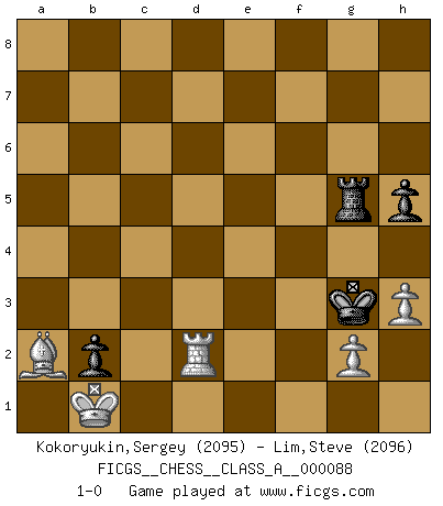 Last move : 1-0 2011 July 29 11:39:27 [Event "FICGS__CHESS__CLASS_A__000088"] [Site "FICGS"] [Date "2011.02.12"] [Round "1"] [White "Kokoryukin,Sergey"] [Black "Lim,Steve"] [Result "1-0"] [WhiteElo "2095"] [BlackElo "2096"] 1.d4 d5 2.c4 c6 3.Nf3 e6 4.Nc3 dxc4 5.a4 Bb4 6.e3 b5 7.Bd2 a5 8.axb5 Bxc3 9.Bxc3 cxb5 10.b3 Bb7 11.Bb2 Nf6 12.bxc4 b4 13.Bd3 O-O 14.O-O Nbd7 15.Nd2 Qc7 16.Bc2 h6 17.f3 e5 18.Bb3 Rfe8 19.Re1 Bc6 20.d5 Bb7 21.Ba4 Re7 22.Bc2 Qd6 23.Kh1 Qb6 24.Qe2 Qc7 25.e4 Nc5 26.f4 Nfd7 27.fxe5 Nxe5 28.Bd4 Rc8 29.Qe3 f6 30.Bd1 Nxc4 31.Nxc4 Rxe4 32.Qg1 Rxe1 33.Qxe1 Bxd5 34.Nxa5 Ne6 35.Bb3 Nxd4 36.Bxd5+ Kh8 37.Bb3 Qc3 38.Rb1 Ra8 39.Qe4 Rc8 40.Bf7 f5 41.Qf4 Qd3 42.Re1 b3 43.Nc4 Nc6 44.h3 Rf8 45.Ne5 Nxe5 46.Qxe5 f4 47.Qxf4 Qd7 48.Be6 Rxf4 49.Bxd7 Rb4 50.Re8+ Kh7 51.Bf5+ g6 52.Re7+ Kh8 53.Bxg6 b2 54.Re1 Kg7 55.Bb1 Kf6 56.Kg1 h5 57.Kf2 Rb5 58.Ke3 Ke5 59.Re2 Rb8 60.Kd3 Kf4 61.Kc2 Rb5 62.Ba2 Kg3 63.Kb1 Rg5 64.Rd2 1-0 QGD Slav : 3.Nf3 Kingside Castling by player Black (move 13) Kingside Castling by player White (move 14) 10 pieces endgame at move 49 : White KRBPP , Black KRPPP WHITE : King + 1 Rook 1 Bishop 2 Pawns BLACK : King + 1 Rook 3 Pawns 9 pieces endgame at move 53 : White KRBPP , Black KRPP WHITE : King + 1 Rook 1 Bishop 2 Pawns BLACK : King + 1 Rook 2 Pawns Player White won this chess game. Follow this game move after move (download)I have added these principles to the law: get the Knights into action before both Bishops are developed. (Emanuel Lasker) Schach ist eine Sache der genauen Beurteilung, wann man zuschlagen und wann man sich ducken muss. (Robert James Fischer) Robert Fischer es la ley hacia si mismo. (Larry Evans) Les échecs sont un jeu terrible. Si vous n'avez pas le centre, votre adversaire a une position plus libre. Par contre, si vous avez le centre, alors vous avez vraiment quelque chose pour laquelle vous inquiéter ! (Siegbert Tarrasch) There are two types of people in this world, good and bad. The good sleep better, but the bad seem to enjoy the waking hours much more. (Woody Allen)