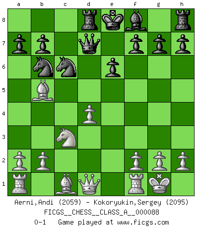 Last move : 0-1 2011 May 2 17:12:28 [Event "FICGS__CHESS__CLASS_A__000088"] [Site "FICGS"] [Date "2011.02.12"] [Round "1"] [White "Aerni,Andi"] [Black "Kokoryukin,Sergey"] [Result "0-1"] [WhiteElo "2059"] [BlackElo "2095"] 1.e4 c5 2.c3 Nf6 3.e5 Nd5 4.Nf3 Nc6 5.d4 cxd4 6.cxd4 d6 7.Bc4 Nb6 8.Bb5 dxe5 9.Nxe5 Bd7 10.Nxd7 Qxd7 11.O-O e6 12.Nc3 Rd8 0-1 Sicilian : Alapin's variation (2.c3) Kingside Castling by player White (move 11) Player Black won this chess game. Follow this game move after move (download)Excellence at Chess is one mark of a scheming mind. (Sir Arthur Conan Doyle) Es gibt Leute, die glauben, alles wäre vernünftig, was man mit einem ernsthaften Gesicht tut. (Georg Christoph Lichtenberg) El Ajedrez es un regaderazo frío para la mente. (Sir John Simon) Les échecs sont utiles à l'exercice de la faculté de penser et à celle de l'imagination. Car nous devons posséder une méthode élaborée pour atteindre des buts partout où nous devons conduire notre raison. (Leibnitz) Luck is the residue of design. (John Milton)