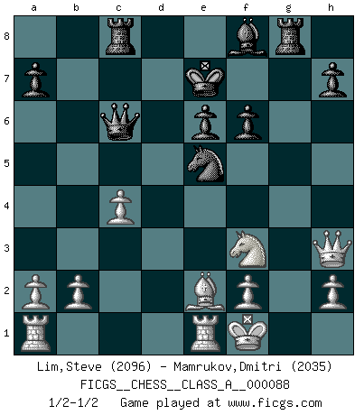 Last move : 1/2-1/2 2011 March 7 2:9:47 [Event "FICGS__CHESS__CLASS_A__000088"] [Site "FICGS"] [Date "2011.02.12"] [Round "1"] [White "Lim,Steve"] [Black "Mamrukov,Dmitri"] [Result "1/2-1/2"] [WhiteElo "2096"] [BlackElo "2035"] 1.e4 c6 2.d4 d5 3.e5 Bf5 4.Nf3 e6 5.Be2 c5 6.Be3 cxd4 7.Nxd4 Ne7 8.Nd2 Nbc6 9.N2f3 Be4 10.O-O Ng6 11.Nxc6 bxc6 12.Nd2 Bxg2 13.Kxg2 d4 14.Bf3 dxe3 15.Bxc6+ Ke7 16.Qg4 f5 17.exf6+ gxf6 18.Nf3 e2 19.Rfe1 Rc8 20.Bb5 Qd5 21.Bxe2 Ne5 22.c4 Qc6 23.Qh3 Rg8+ 24.Kf1 1/2-1/2 Caro-Kann : Advance variation Kingside Castling by player White (move 10) This chess game ended in a draw. Follow this game move after move (download)Many Chess players were surprised when after the game, Fischer quietly explained: 'I had already analyzed this possibility' in a position which I thought was not possible to foresee from the opening. (Mikhail Tal) Matt entspricht nicht immer den Tatsachen. (Savielly Grigorievitsch Tartakower) Una victoria por una combinación errónea, aunque sea espectacular, me llena de horror artístico. (Wilhelm Steinitz) Dieu déplace le joueur, et celui-ci la pièce. Quel Dieu derrière Dieu commence donc la trame ? Arturo Perez-Reverte (prix de littérature policière 1993). Excelling at chess has long been considered a symbol of more general intelligence. That is an incorrect assumption in my view, as pleasant as it might be. But for the purposes of argument and investigation, chess is, in Russkin-Gutman's words, 'an unparalleled laboratory, since both the learning process and the degree of ability obtained can be objectified and quantified, providing an excellent comparative framework on which to use rigorous analytical techniques.' (The Chess Master and the Computer, by Garry Kasparov - 2010)