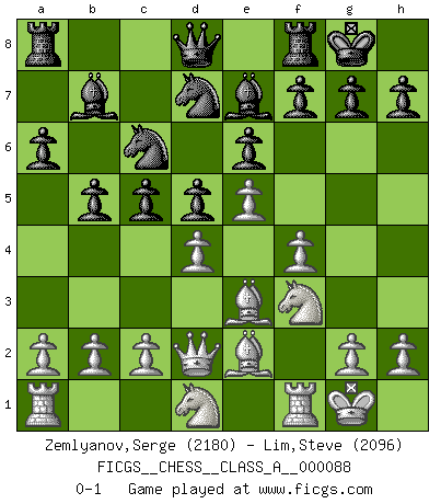 Last move : 0-1 2011 May 10 5:59:25 [Event "FICGS__CHESS__CLASS_A__000088"] [Site "FICGS"] [Date "2011.02.12"] [Round "1"] [White "Zemlyanov,Serge"] [Black "Lim,Steve"] [Result "0-1"] [WhiteElo "2180"] [BlackElo "2096"] 1.e4 e6 2.d4 d5 3.Nc3 Nf6 4.e5 Nfd7 5.f4 c5 6.Nf3 Nc6 7.Be3 Be7 8.Be2 O-O 9.Qd2 a6 10.O-O b5 11.Nd1 Bb7 0-1 This chess game has been lost on time (started : 2011.02.12 1:32:3) French : Steinitz, Boleslavsky variation Kingside Castling by player Black (move 8) Kingside Castling by player White (move 10) Player Black won this chess game. Follow this game move after move (download)Every Chess master was once a beginner. (Chernev) Kostenjuk hat keinen Sexappeal. (Loek van Wely) Hasta este punto, las blancas han seguido un análisis bien conocido. Pero ahora el hace un error fatal: empieza a usar su propia cabeza. (Siegbert Tarrasch) Votre seul travail dans les ouvertures est d'obtenir un milieu de partie jouable. (Lajos Portish) Unless in communicating with it one says exactly what one means, trouble is bound to result. (Alan Turing, about computers)