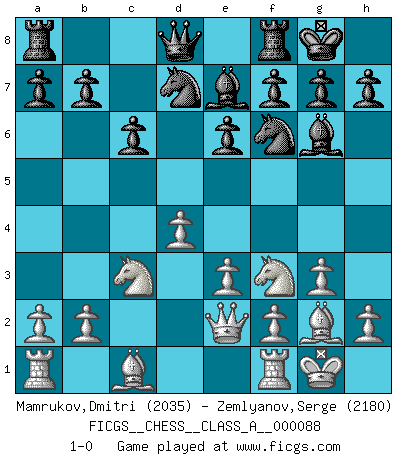 Last move : 1-0 2011 May 6 17:37:13 [Event "FICGS__CHESS__CLASS_A__000088"] [Site "FICGS"] [Date "2011.02.12"] [Round "1"] [White "Mamrukov,Dmitri"] [Black "Zemlyanov,Serge"] [Result "1-0"] [WhiteElo "2035"] [BlackElo "2180"] 1.d4 d5 2.c4 c6 3.Nf3 Nf6 4.Qc2 dxc4 5.Qxc4 Bf5 6.g3 e6 7.Bg2 Nbd7 8.O-O Be7 9.e3 O-O 10.Qe2 Bg6 11.Nc3 1-0 This chess game has been lost on time (started : 2011.02.12 1:32:3) QGD Slav : 3.Nf3 Kingside Castling by player White (move 8) Kingside Castling by player Black (move 9) Player White won this chess game. Follow this game move after move (download)Chess books should be used as we use glasses: to assist the sight, although some players make use of them as if they thought they conferred sight. (Jose Raul Capablanca) Gegen einen Schachcomputer zu verlieren ist wie Löcher in den Strümpfen zuhaben. Es ist nicht peinlich, solange man der einzige ist der es weiß. (Anonymous) Un juego de Ajedrez es un dialogo, una conversación entre un jugador y su oponente. Cada movimiento del oponente puede contener amenazas o tropiezos, pero un jugador no se puede defender de las amenazas o tomar ventaja de los tropiezos si es que no se pregunta a sí mismo: ¿Que es lo que mi oponente va a hacer después de cada movida?. (Bruce A. Moon) Les Echecs sont et restent toujours un combat, un combat intégral comme la boxe, la lutte ou un autre sport, et où il doit y avoir un vainqueur et un vaincu. (Joseph Emil Diemer) Question: Is 'This statement is paradoxical' a paradoxical statement ? Or is it a meta-paradox ? (Normajean Yates)