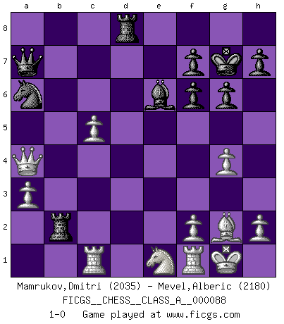 Last move : 1-0 2011 July 27 11:18:3 [Event "FICGS__CHESS__CLASS_A__000088"] [Site "FICGS"] [Date "2011.02.12"] [Round "1"] [White "Mamrukov,Dmitri"] [Black "Mevel,Alberic"] [Result "1-0"] [WhiteElo "2035"] [BlackElo "2180"] 1.d4 Nf6 2.c4 g6 3.g3 Bg7 4.Bg2 O-O 5.Nc3 d6 6.Nf3 Nc6 7.O-O a6 8.Qd3 b5 9.cxb5 Nb4 10.Qd1 axb5 11.e4 c5 12.e5 Nfd5 13.exd6 Qxd6 14.Ne4 Qb8 15.dxc5 Rd8 16.Bf4 Qa7 17.Be5 Bf5 18.Qe2 Nf6 19.Bxf6 Bxf6 20.Nxf6+ exf6 21.Ne1 Rac8 22.Qxb5 Rb8 23.Qc4 Kg7 24.a3 Na6 25.Rc1 Rxb2 26.g4 Be6 27.Qa4 1-0 This chess game has been lost on time (started : 2011.02.12 1:32:3) King's Indian : 3.g3 Kingside Castling by player Black (move 4) Kingside Castling by player White (move 7) Player White won this chess game. Follow this game move after move (download)I feel as if I were a piece in a game of Chess, when my opponent says of it: That piece cannot be moved. (Soren Kierkegaard) Das Schach hält seine Meister in eigenen Banden, Fesseln; auf vielerlei Weise formt es ihren Geist, so dass die innere Freiheit selbst des Stärksten beeinflusst wird. (Albert Einstein) El Ajedrez, como cualquier otra actividad creativa, puede existir solo a través de méritos combinados de aquellos que tienen talento creativo y de aquellos que tienen la habilidad de organizar un trabajo creativo. (Mikhail Botvinnik) Pour moi, les échecs ne sont pas un jeu mais un art. (Alexandre Alekhine) The only thing that matters is the evidence. (Horatio Caine, C.S.I. Miami)